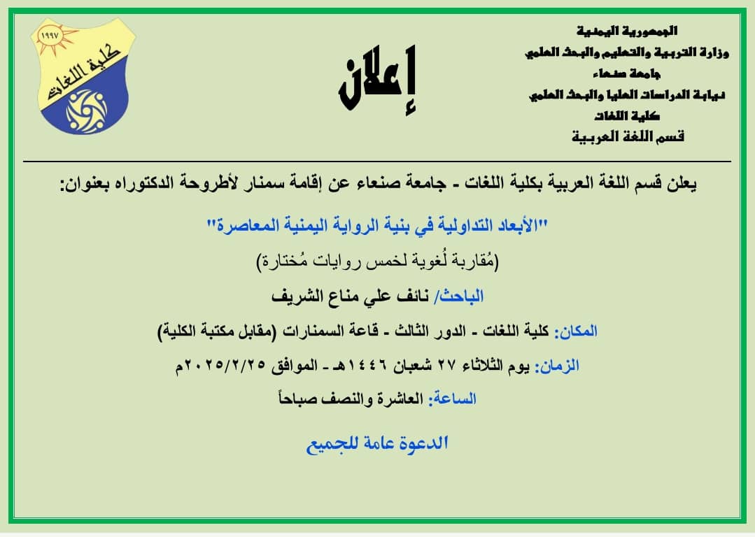 يعلن قسم اللغة العربية بكلية اللغات – جامعة صنعاء عن إقامة سمنار لأطروحة الدكتوراة بعنوان: الأبعاد التداولية في بنية الرواية اليمنية المعاصرة: (مقاربة لغوية لخمس روايات مختارة) الباحث/ نائف علي مناع علي الشريف المكان: كلية اللغات – الدور الثالث – …