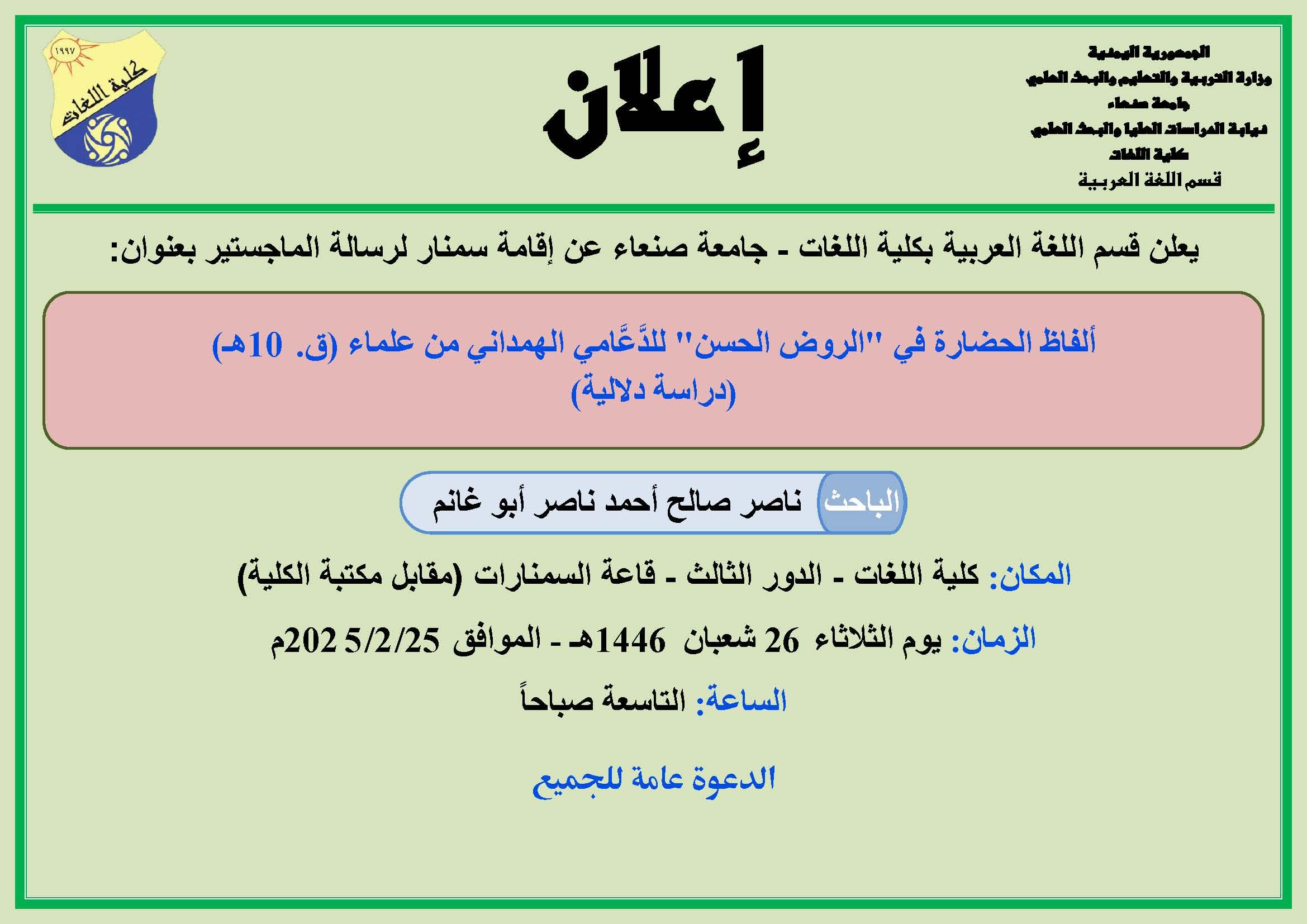 يعلن قسم اللغة العربية بكلية اللغات – جامعة صنعاء عن إقامة سمنار لرسالة الماجستير بعنوان: “ألفاظ الحضارة في “الروض الحسن” للدَّعَّامي الهمداني من علماء (ق. 10هـ):(دراسة دلالية)” “Culture Articulations in “Al Rawdh Al Hassan” for Al Da’ami Al Hamadany, One …