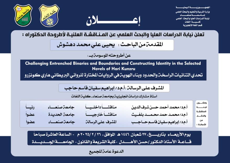 تعلن نيابة الدراسات العليا والبحث العلمي عن المناقشة العلنية لأطروحة الدكتوراة المقدمة من الباحث: يحيى علي محمد دهشوش عن أطروحته الموسومة بـ: “Challenging Entrenched Binaries and Boundaries and Constructing Identity in the Selected Novels of Hari Kunzru” “تحدي الثنائيات الراسخة …