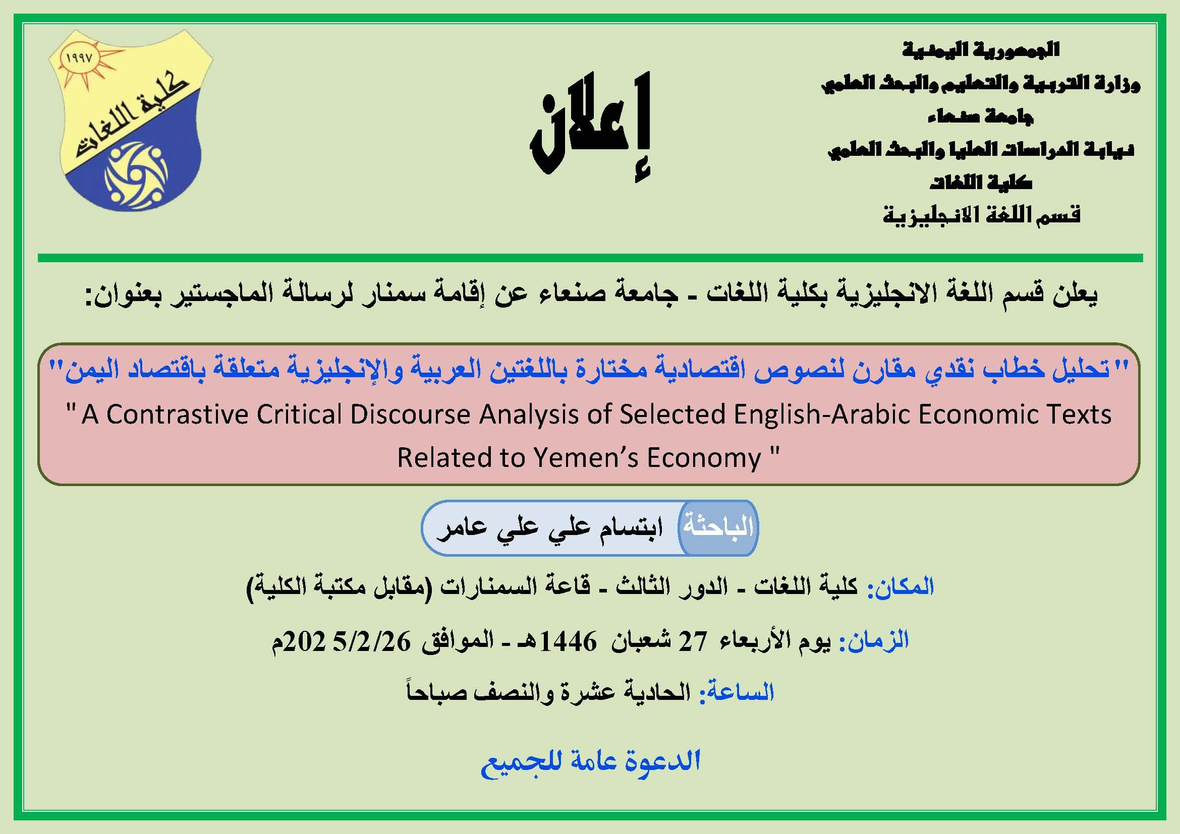 يعلن قسم اللغة الانجليزية بكلية اللغات – جامعة صنعاء عن إقامة سمنار لأطروحة الدكتوراة بعنوان: “تحليل نوعي تقابلي: الإعلانات التجارية بين الإنجليزية والعربية على منصات التواصل الإجتماعي” “Contrastive Genre Analysis: Commercial Advertisements Between English and Arabic on Social Media Platforms“ …