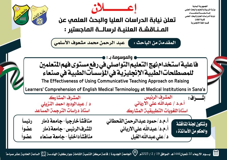 تعلن نيابة الدراسات العليا والبحث العلمي عن المناقشة العلنية لرسالة الماجستير المقدمة من الباحث: عبد الرحمن محمد مشعوف الأسلمي عن رسالته الموسومة بـ: The Effectiveness of Using Communicative Teaching Approach on Raising Learners’ Comprehension of English Medical Terminology at Medical …