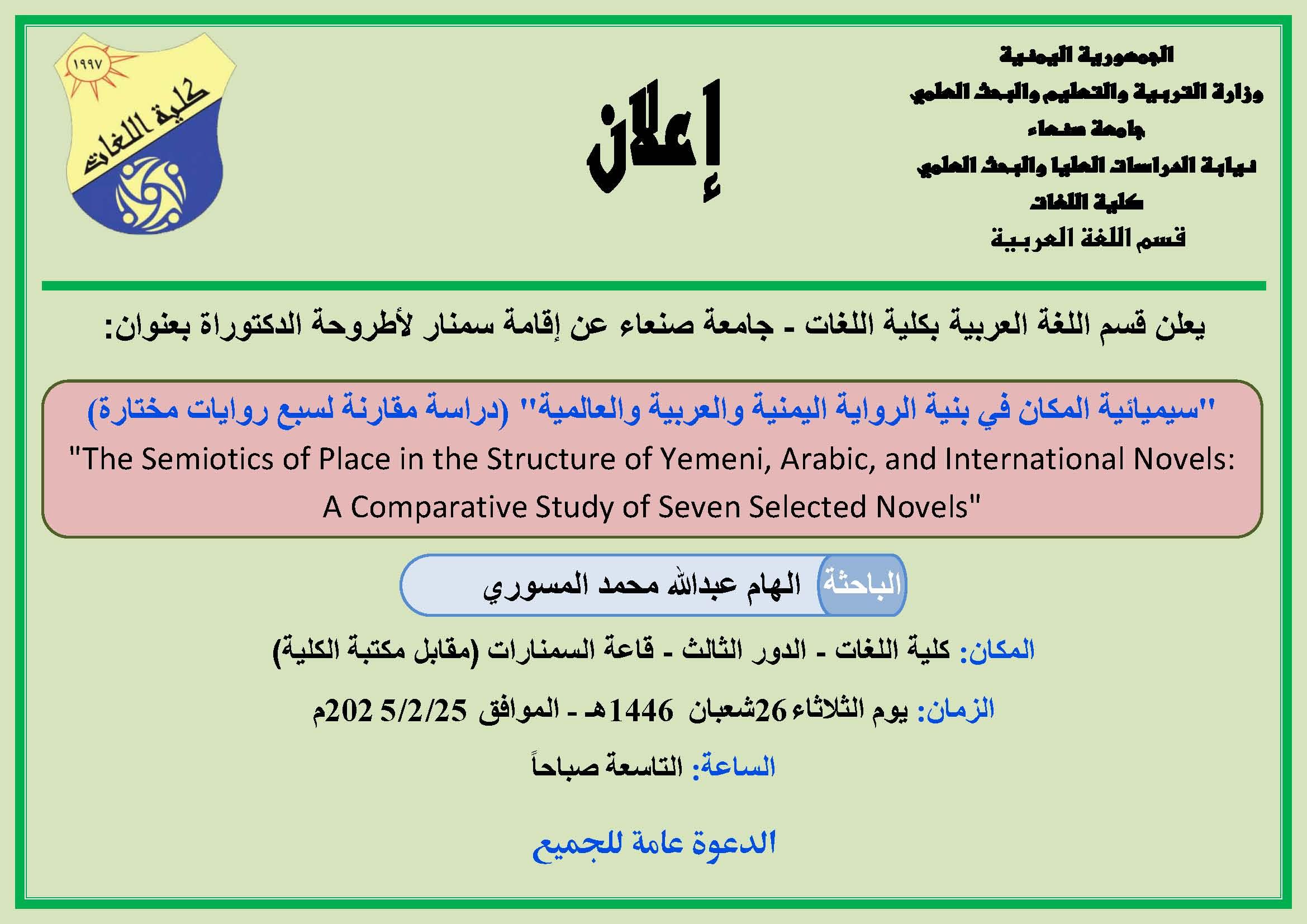 يعلن قسم اللغة العربية بكلية اللغات – جامعة صنعاء عن إقامة سمنار لأطروحة الدكتوراة بعنوان: “سيميائية المكان في بنية الرواية اليمنية والعربية والعالمية” (دراسة مقارنة لسبع روايات مختارة” “The Semiotics of Place in the Structure of Yemeni, Arabic, and International …
