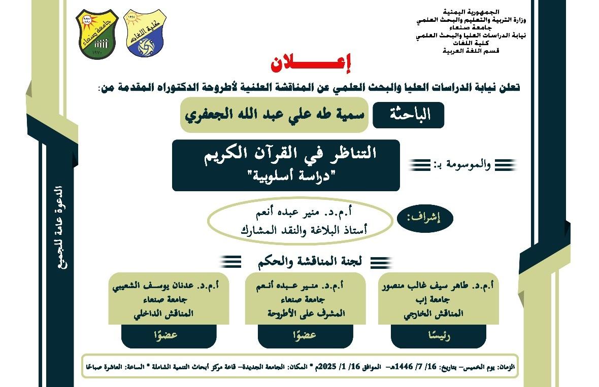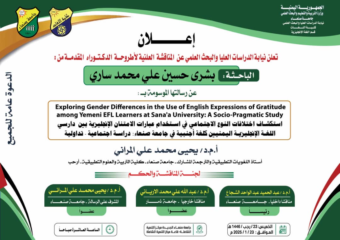 تعلن نيابة الدراسات العليا والبحث العلمي عن المناقشة العلنية لأطروحة الدكتوراه المقدمة من الباحثة: بشرى حسين علي محمد ساري عن أطروحتها الموسومة بـــ: Exploring Gender Differences in the Use of English Expressions of Gratitude among Yemeni EFL Learners at Sana’a …