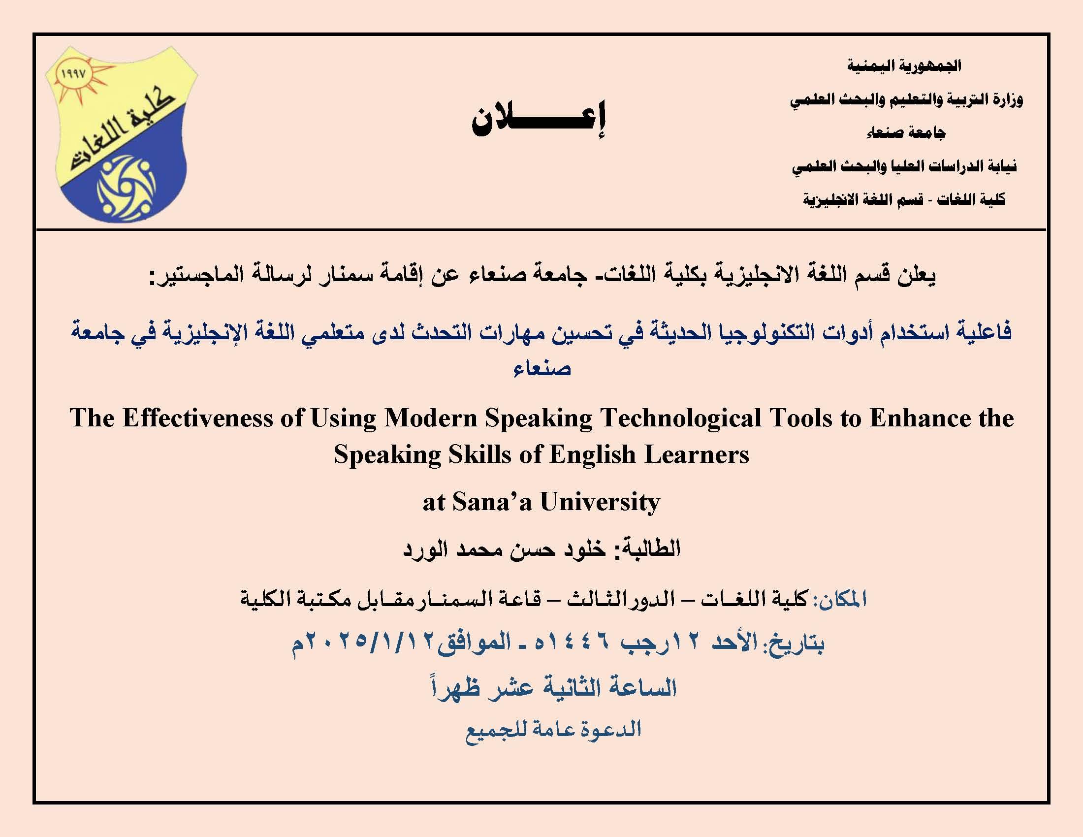 يعلن قسم اللغة الانجليزية بكلية اللغات – جامعة صنعاء عن إقامة سمنار لرسالة الماجستير بعنوان: “فاعلية استخدام أدوات التكنولوجيا الحديثة في تحسين مهارات التحدث لدى متعلمي اللغة الإنجليزية في جامعة صنعاء” “The Effectiveness of Using Modern Speaking Technological Tools to …