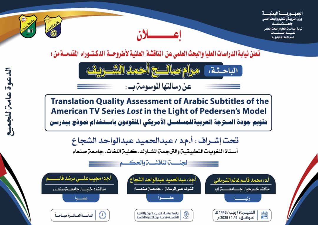 تعلن نيابة الدراسات العليا والبحث العلمي عن المناقشة العلنية لأطروحة الدكتوراه المقدمة من الباحثة: مرام صالح احمد الشريف عن أطروحتها الموسومة بـــ: تقويم جودة السترجة العربية للمسلسل الأمريكي المفقودون باستخدام نموذج بيدرسن Translation Quality Assessment of Arabic Subtitles of the …