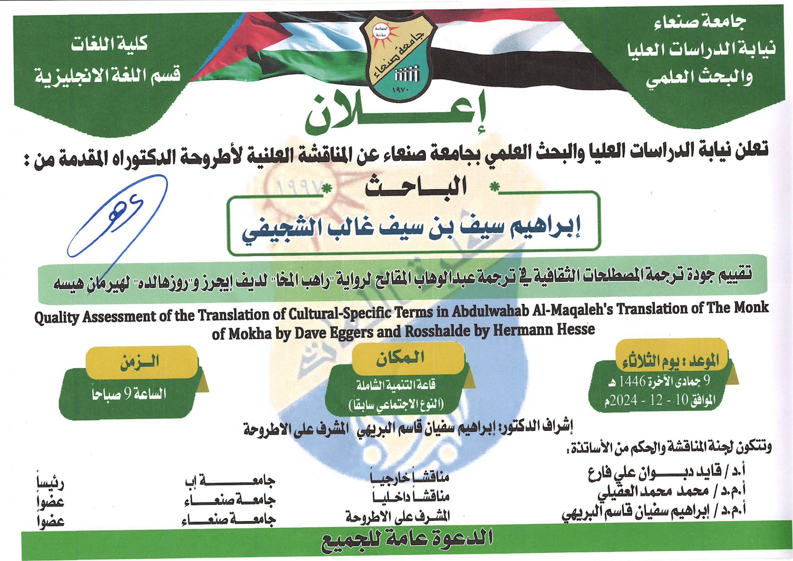تعلن نيابة الدراسات العليا والبحث العلمي عن المناقشة العلنية لأطروحة الدكتوراة المقدمة من الباحث: إبراهيم سيف بن سيف غالب الشجيفي عن أطروحته الموسومة بـــ: تقييم جودة ترجمة المصطلحات الثقافية في ترجمة عبدالوهاب المقالح لرواية “راهب المخا” لديف إيجرز” و”روزهالده” لهيرمان …