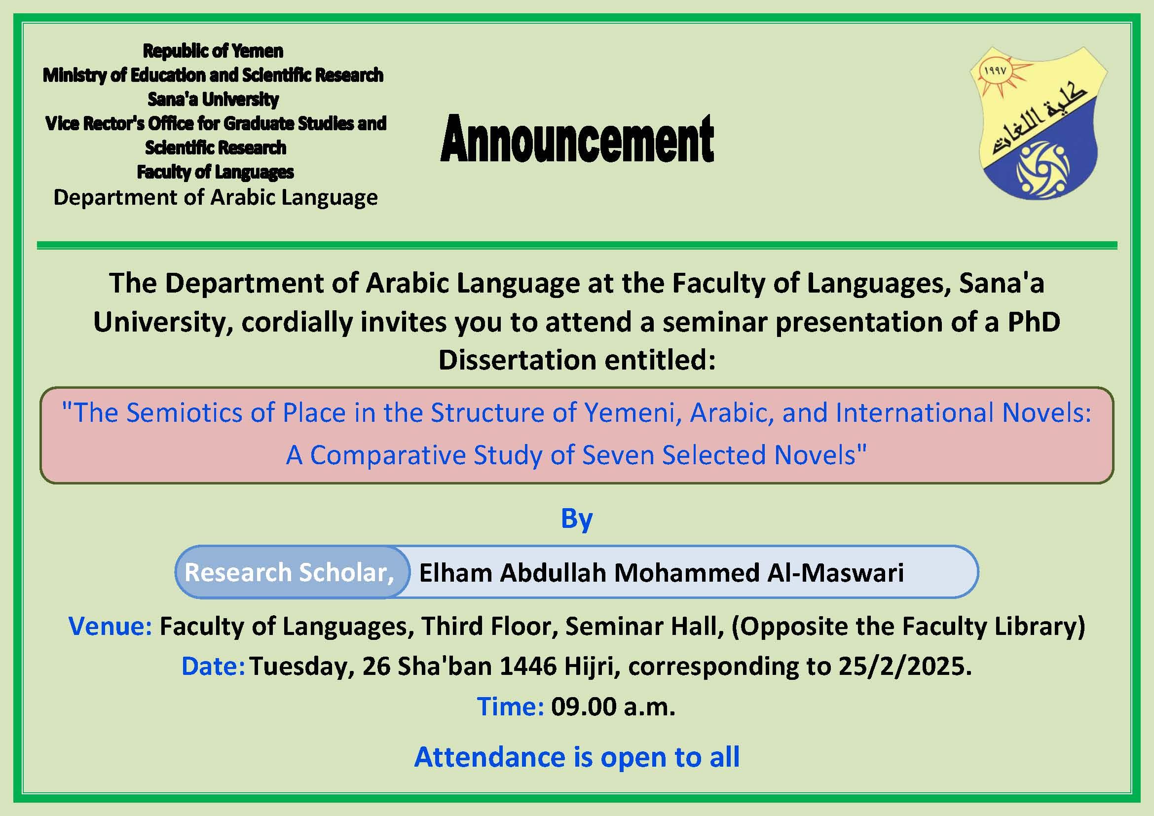 The Department of Arabic Language, Faculty of Languages, Sana’a University, cordially invites you to attend a seminar presentation of a Ph.D. Dissertation entitled: