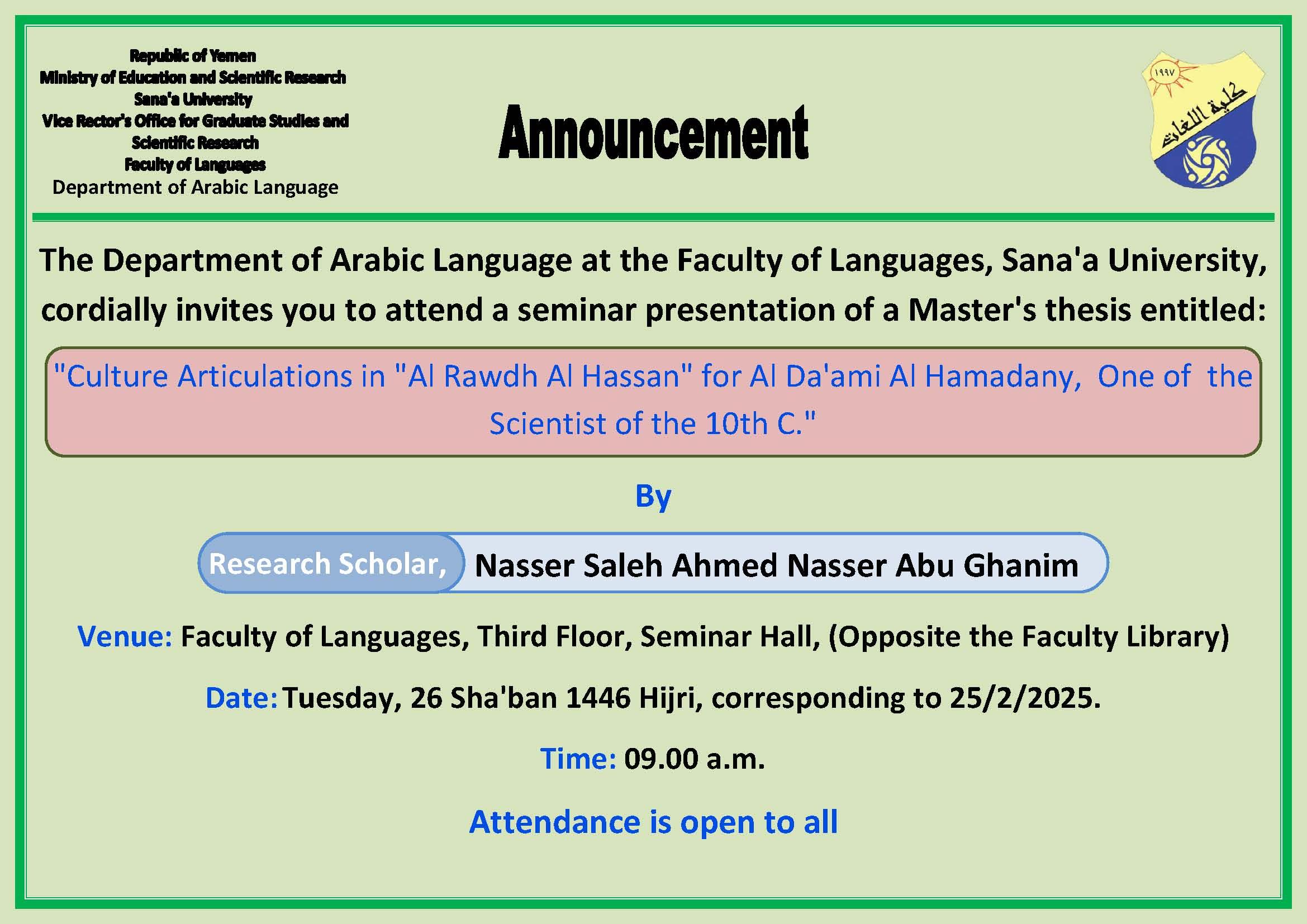The Department of Arabic Language, Faculty of Languages, Sana’a University, cordially invites you to attend a seminar presentation of a Master’s thesis entitled: