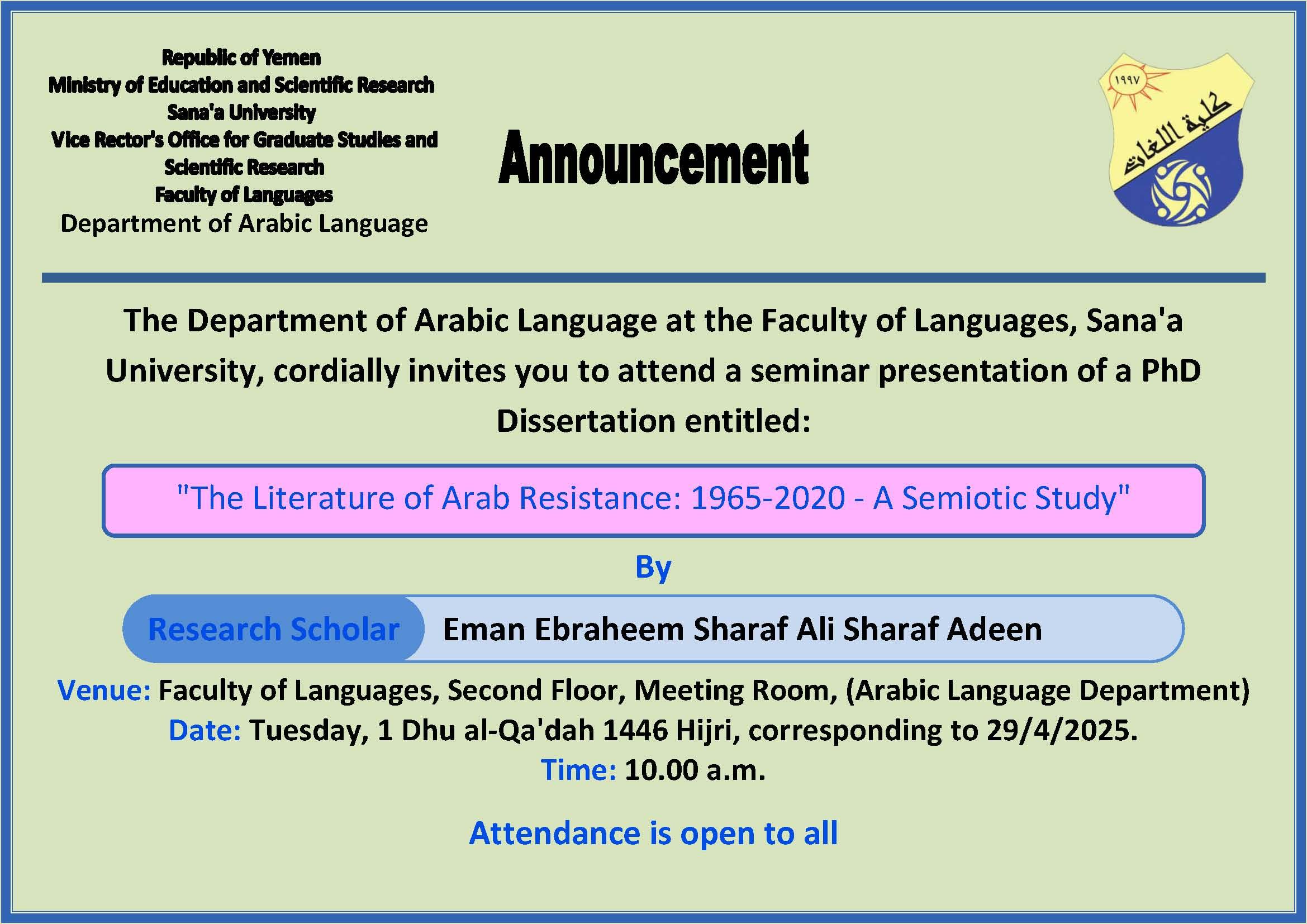 The Department of Arabic Language, Faculty of Languages, Sana’a University, cordially invites you to attend a seminar presentation of a Ph.D. Dissertation entitled: