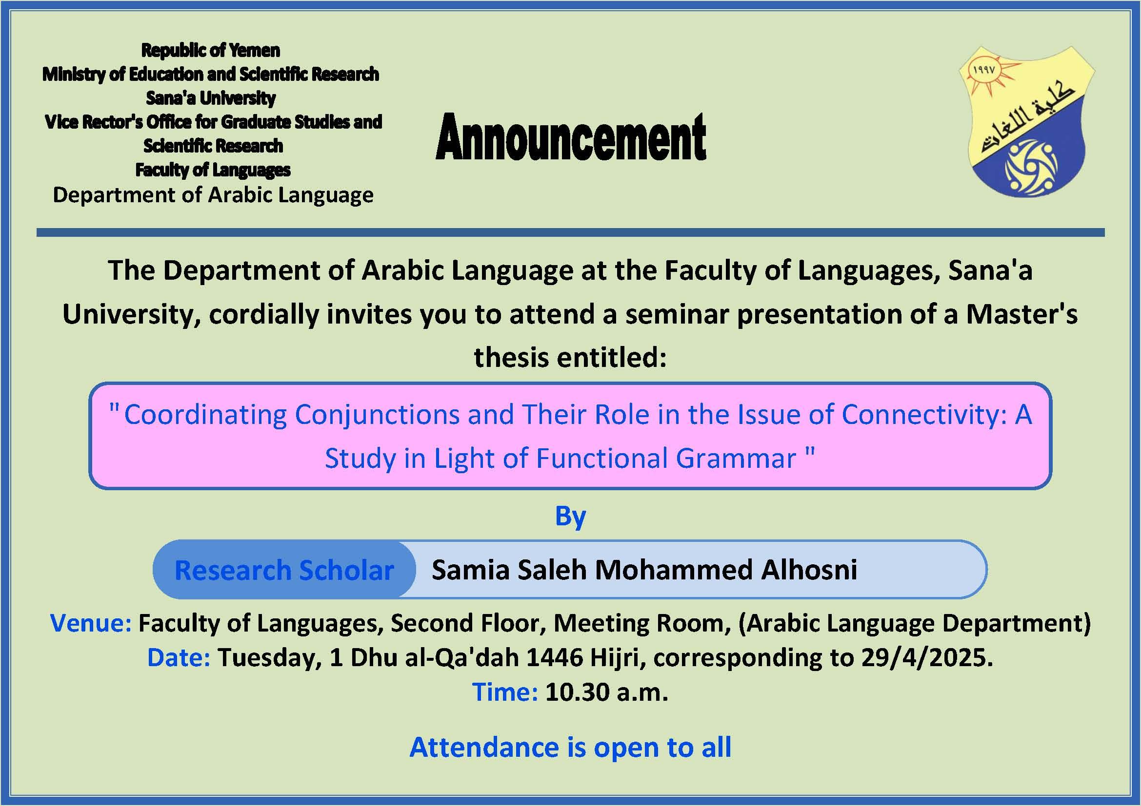 The Department of Arabic Language, Faculty of Languages, Sana’a University, cordially invites you to attend a seminar presentation of a Master’s thesis entitled: