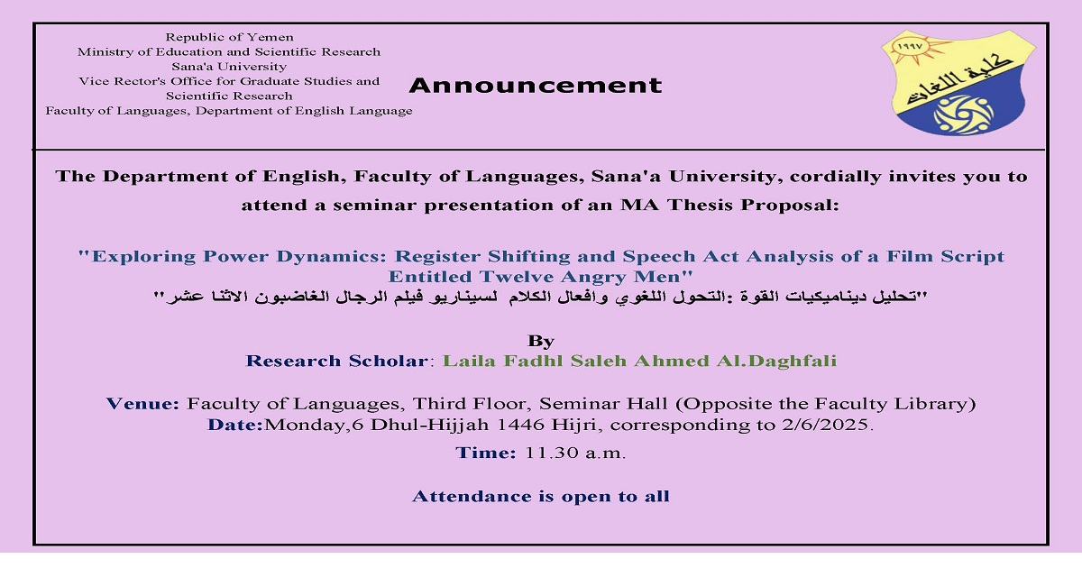 Announcement of a Seminar for the Master’s Thesis Proposal of Ms. Laila Al.Daghfali Posted by كلية اللغات جامعة الصنع Categories news Date June 1, 2025 The Department of English, Faculty of Languages, Sana’a University, cordially invites you to attend a seminar presentation of an MAThesis Proposal: “Exploring Power Dynamics: Register Shifting and Speech Act Analysis of a Film Script Entitled Twelve Angry Men” by Research Scholar, Laila Fadhl Saleh Ahmed Al.Daghfali Venue: Faculty of Languages, Third Floor, Seminar Hall(Opposite the Faculty Library) Date: Monday, 6 Dhu al Hijjah 1446 Hijri, corresponding to 2/6/2025. Time: 11.30 a.m. Attendance is open to all Share: كلية اللغات جامعة الصنع Previous post Announcement of a Seminar for the Master's Thesis Proposal of Ms. Asma Kamel June 1, 2025 Next post Announcement of a Seminar for the PhD Dissertation Proposal of Mr. Khaled Al-Quzahy June 1, 2025 You may also like Announcement: Second Semester 2026 Results and Grade Appeal Period 3 March, 2026 Master’s Thesis Proposal Seminar for Mr. Jehad Mohsen Ahmed Salman 19 February, 2026 Master’s Thesis Proposal Seminar for Mr. Dawood Hameed Abdu Hamoud 19 February, 2026