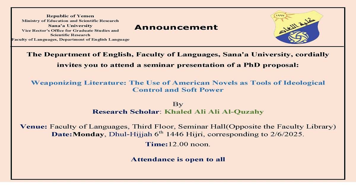 Announcement of a Seminar for the PhD Dissertation Proposal of Mr. Khaled Al-Quzahy Posted by كلية اللغات جامعة الصنع Categories news Date June 1, 2025 The Department of English, Faculty of Languages, Sana’a University, cordially invites you to attend a seminar presentation of a PhD proposal: “Weaponizing Literature: The Use of American Novels as Tools of Ideological Control and Soft Power” by Research Scholar, Khaled Ali Ali Al-Quzahy Venue: Faculty of Languages, Third Floor, Seminar Hall (Opposite the Faculty Library) Date: Monday, 6 Dhu al Hijjah 1446 Hijri, corresponding to 2/6/2025. Time: 12.00 noon. Attendance is open to all Share: كلية اللغات جامعة الصنع Previous post Announcement of a Seminar for the Master's Thesis Proposal of Ms. Laila Al.Daghfali June 1, 2025 Next post Announcement of a Seminar for the Master's Thesis Proposal of Mr. Saleh Al-Salemi June 1, 2025 You may also like Announcement: Second Semester 2026 Results and Grade Appeal Period 3 March, 2026 Master’s Thesis Proposal Seminar for Mr. Jehad Mohsen Ahmed Salman 19 February, 2026 Master’s Thesis Proposal Seminar for Mr. Dawood Hameed Abdu Hamoud 19 February, 2026