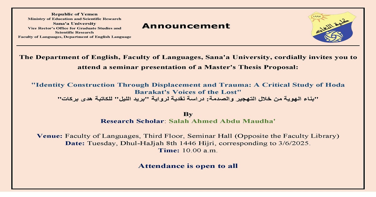 The Department of English, Faculty of Languages, Sana’a University, cordially invites you to attend a seminar presentation of a Master’s Thesis Proposal: