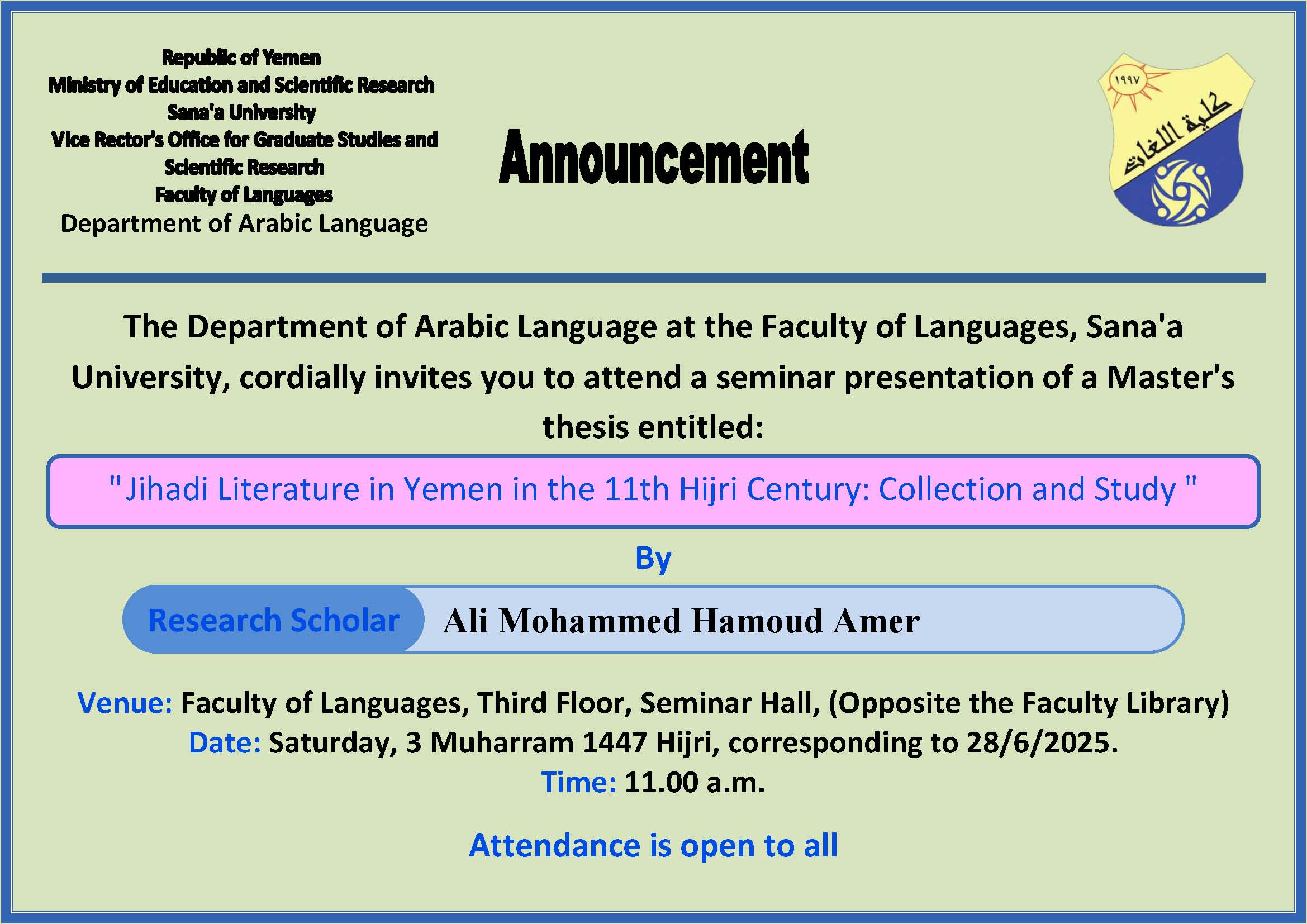 The Department of Arabic Language at the Faculty of Languages, Sana’a University, cordially invites you to attend a seminar presentation of a Master’s Thesis entitled:
