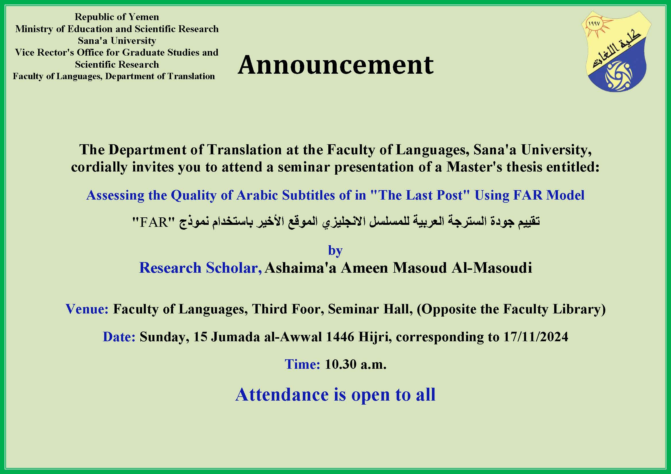 The Department of Translation at the Faculty of Languages, Sana’a University, cordially invites you to attend a seminar presentation of a Master’s thesis entitled: Assessing the Quality of Arabic Subtitles of in “The Last Post” Using FAR Model تقييم جودة …