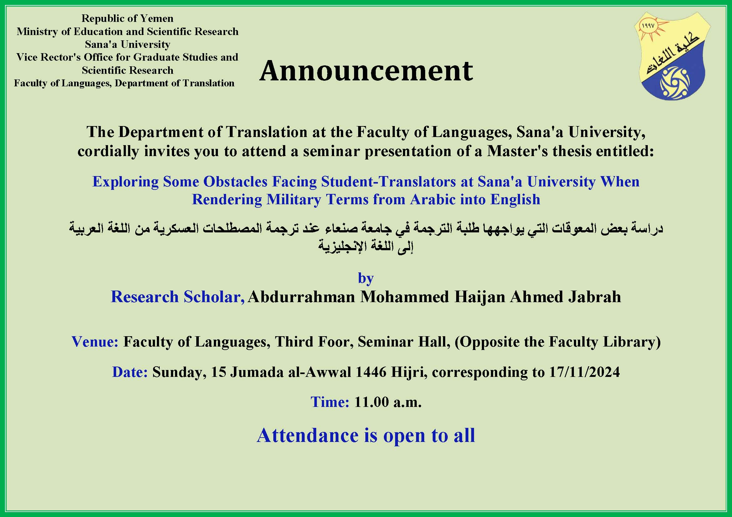 The Department of Translation at the Faculty of Languages, Sana’a University, cordially invites you to attend a seminar presentation of a Master’s thesis entitled: Exploring Some Obstacles Facing Student-Translators at Sana’a University When Rendering Military Terms from Arabic into English …