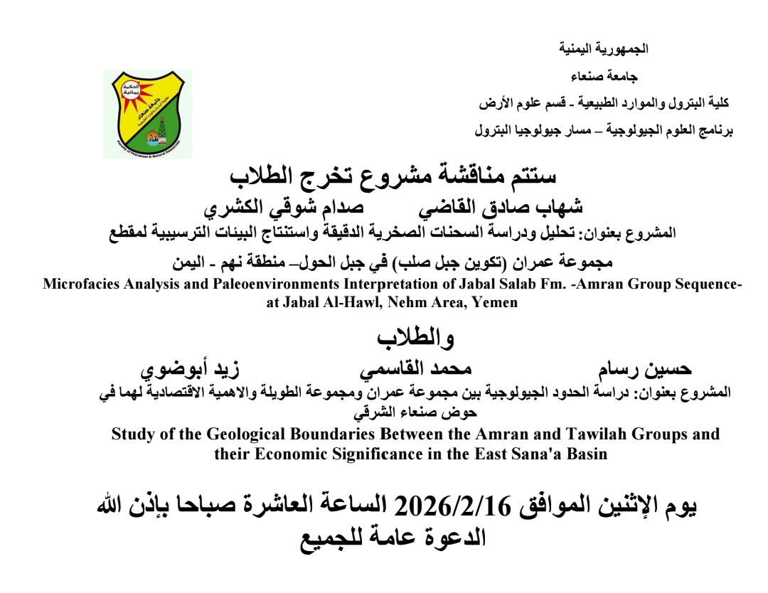 شهدت كلية البترول والموارد الطبيعية بجامعة صنعاء يوم الاثنين الموافق 16 فبراير 2026م مناقشة علنية لمشاريع تخرج كوكبة من طلاب برنامج العلوم الجيولوجية مسار جيولوجيا البترول، حيث قدم الطلاب شهاب صادق القاضي وصدام شوقي الكشري مشروعهم البحثي الذي تناول تحليل …