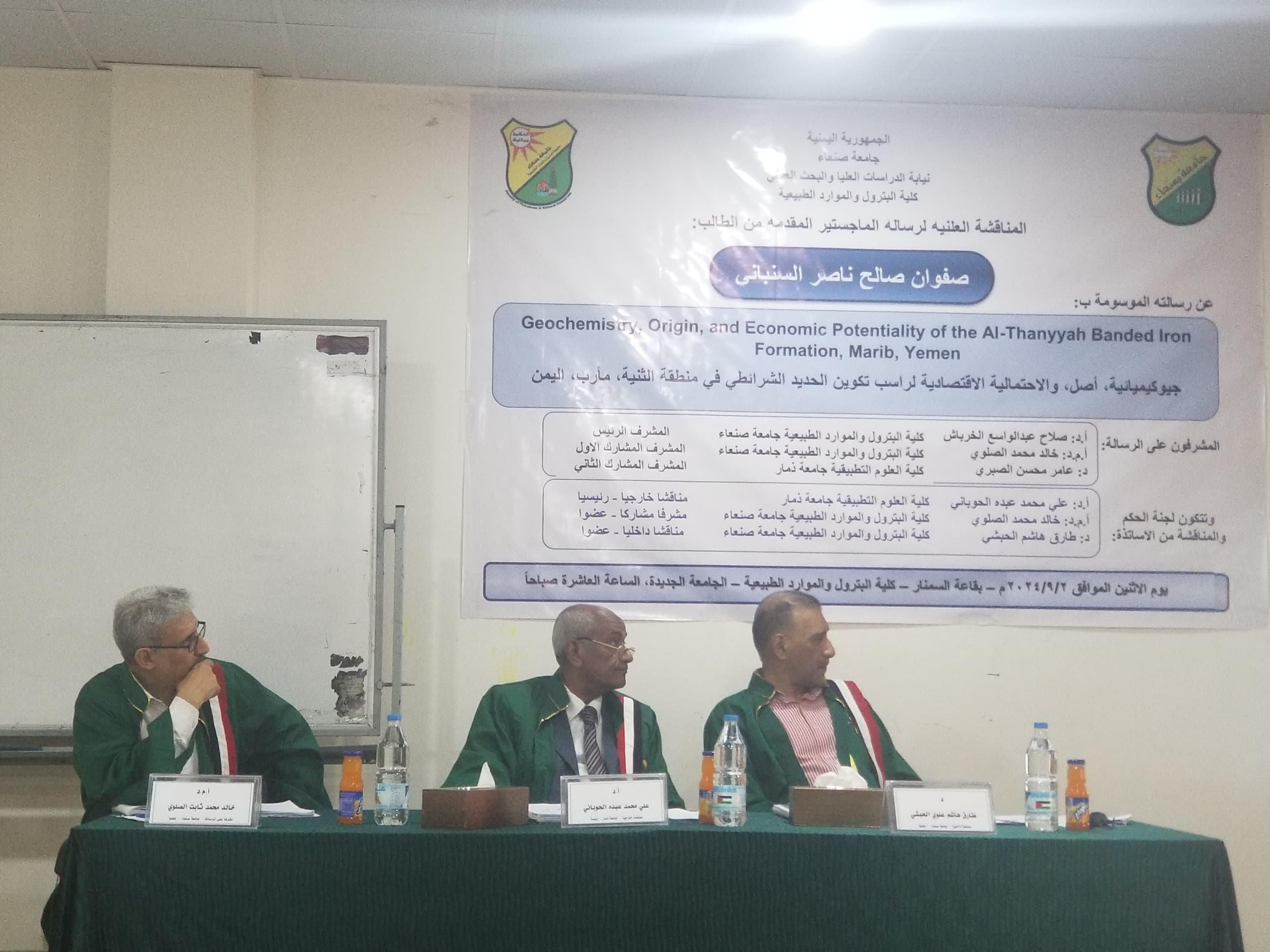 في يوم الاثنين 23 شعبان 1445هجرية، الموافق 4 مارس 2024م تمت في رحاب جامعة صنعاء ، قاعة السيمنار بكلية البترول والموارد الطبيعية المناقشة العلنية لرسالة الماجستير في الجيولوجيا البحرية المقدمة من الباحثة / ريم محمد علي معمر، والموسومة ب “المثقبات …