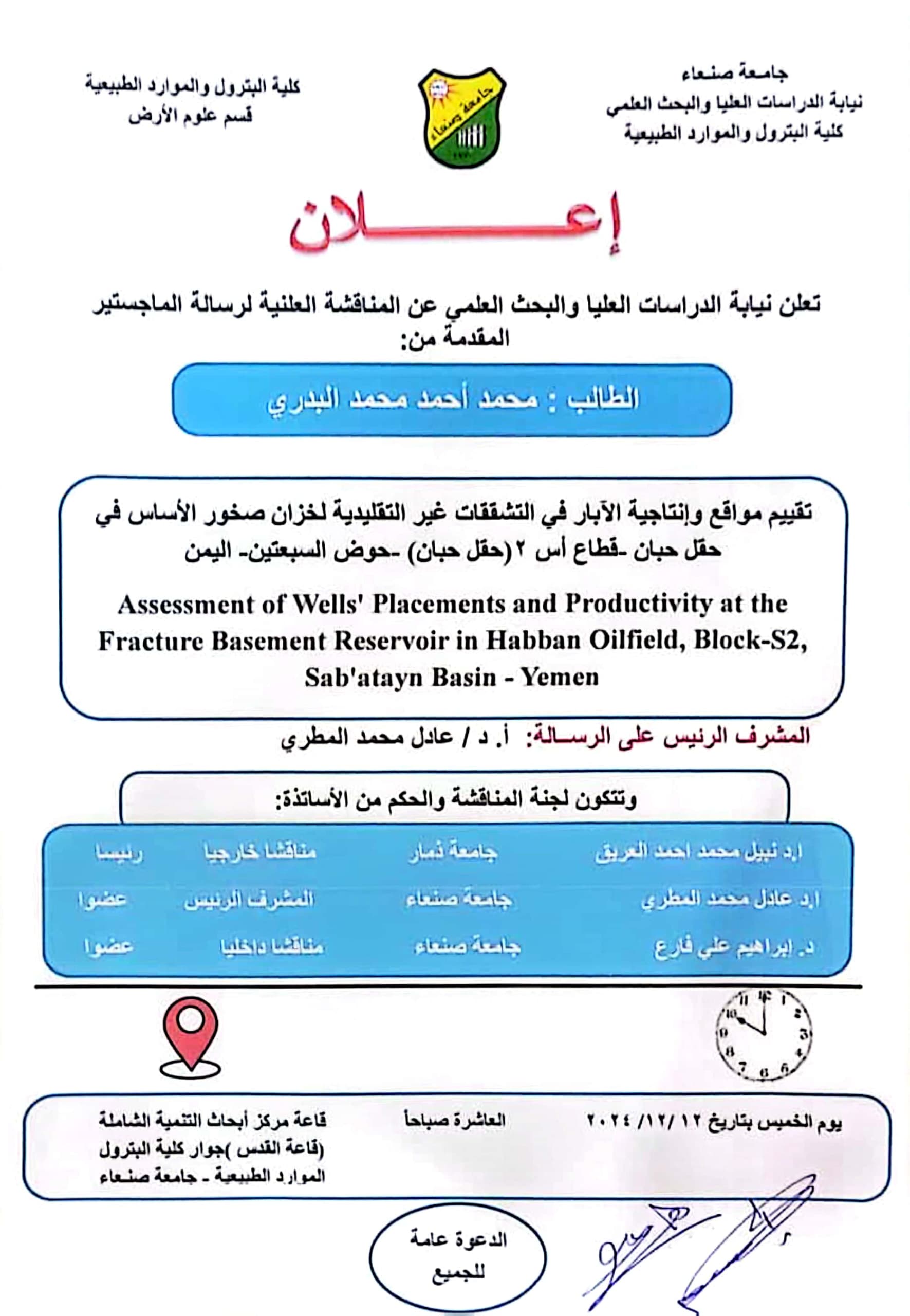 تعلن نيابة الدراسات العليا والبحث العلمي بجامعة صنعاء عن المناقشة العلنية لرسالة الماجستير المقدمة من الباحث/ عزمي صالح العودي، قسم علوم الأرض بكلية البترول والموارد الطبيعية – جامعة صنعاء، عن رسالته الموسومة بـ: “احتمالية تواجد الهيدروكربونات في عضو لام من …