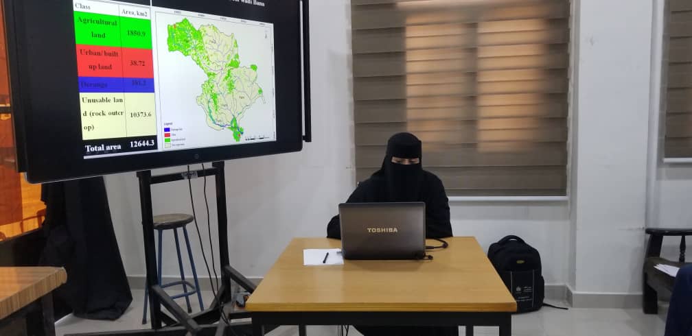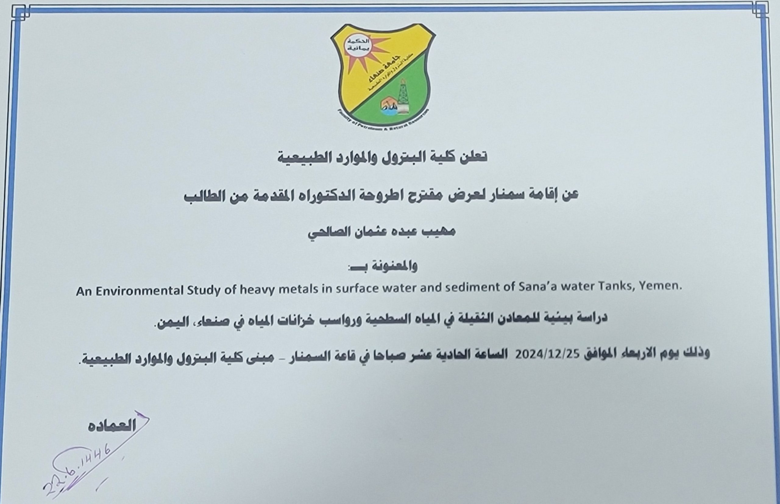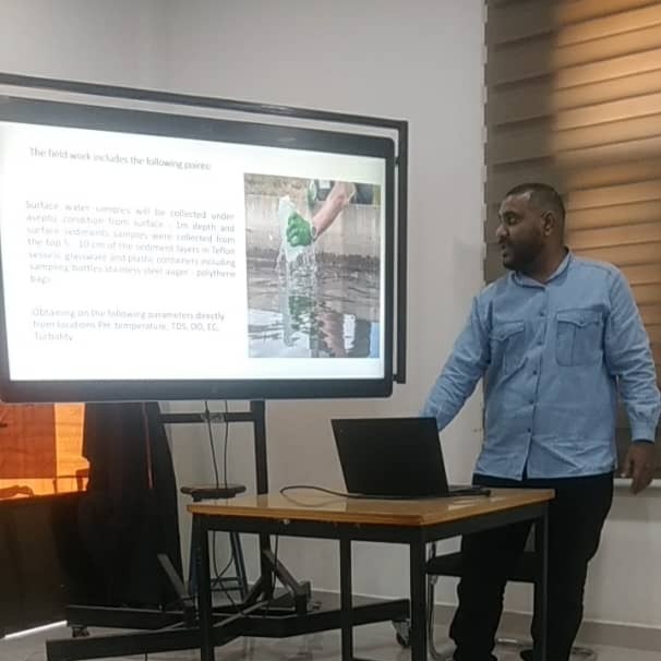 اقيم اليوم بكلية الطيبة عرض نموذج العرض الطبيعي اطروحة الدكتوراة للطالب / مهيب عبده عثمان الصالحي بعنوان An Environmental Study of heavy metals in surface water and sediment of Sana’a water Tanks, Yemen.