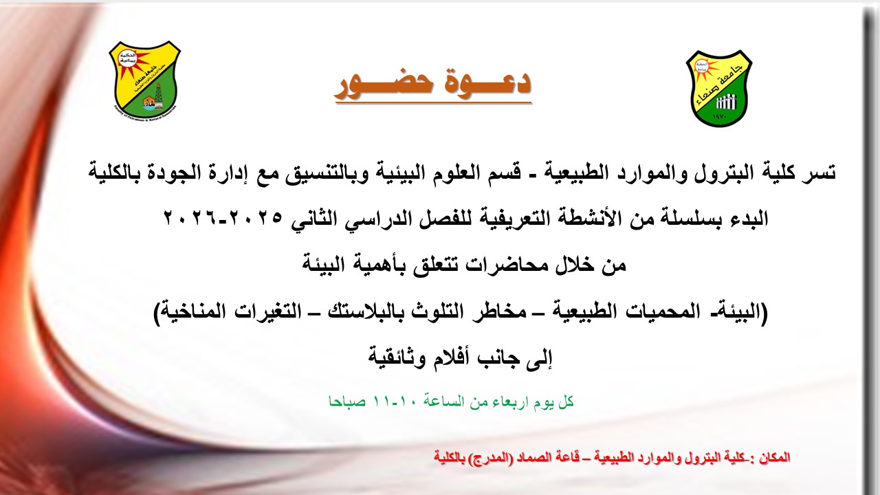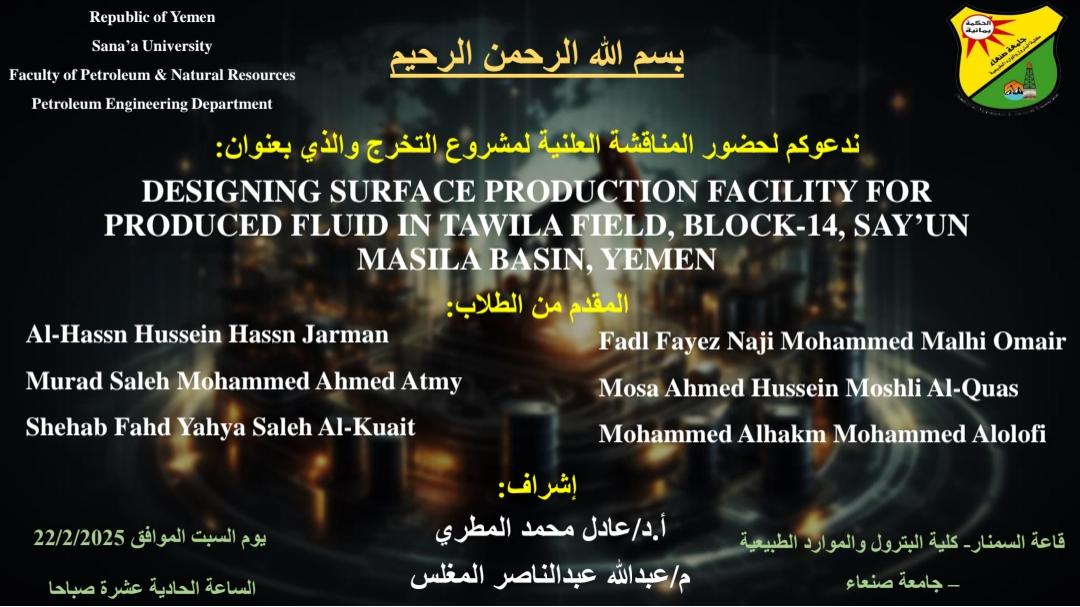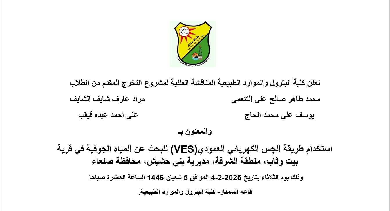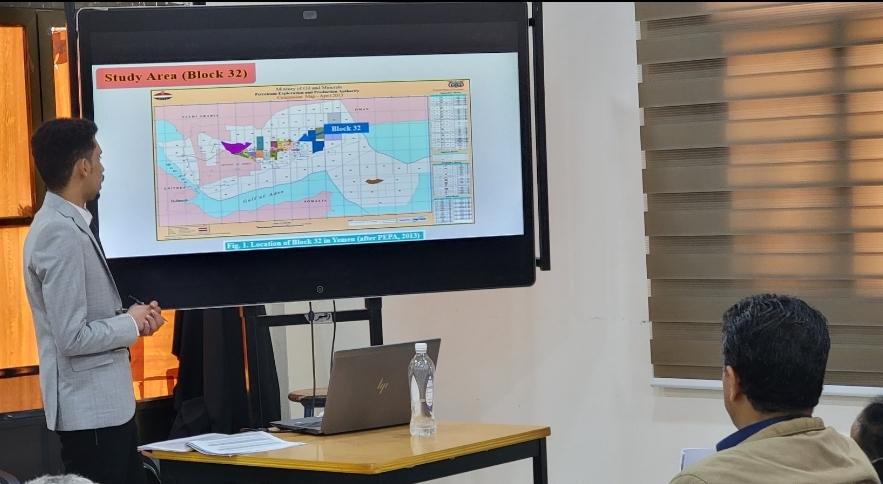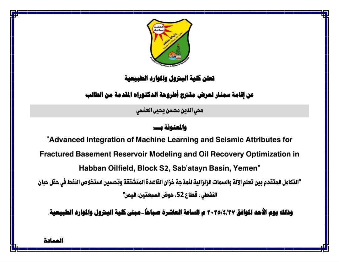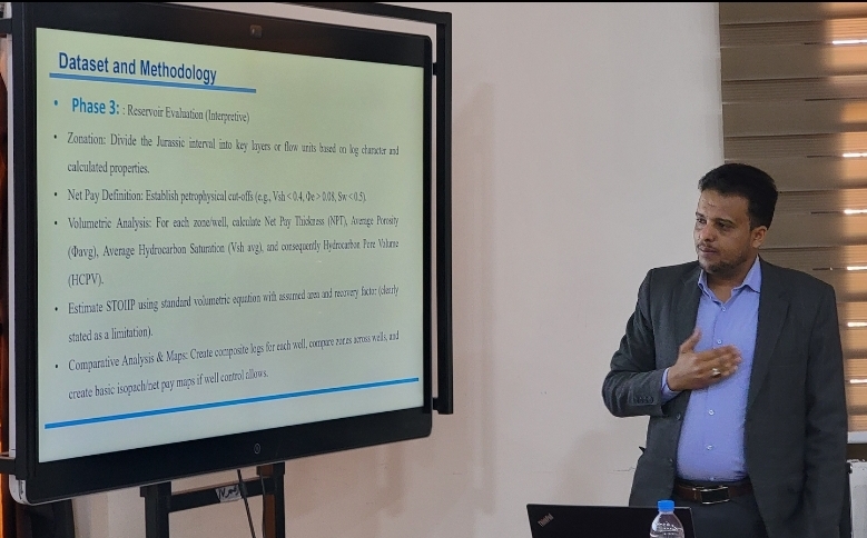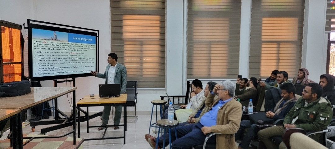 صنعاء : الإثنين 9فبراير 2026م الموافق 22 شعبان 1447هـ شهدت كلية البترول والموارد الطبيعية بجامعة صنعاء اليوم إقامة سمنار لعرض مقترح رسالة الماجستير المقدمة من الطالب الباحث: صدام حسين علي معوض، بعنوان: “ تقييم مكامن الهيدروكربونات المحتملة لرواسب العصر الجوراسي …