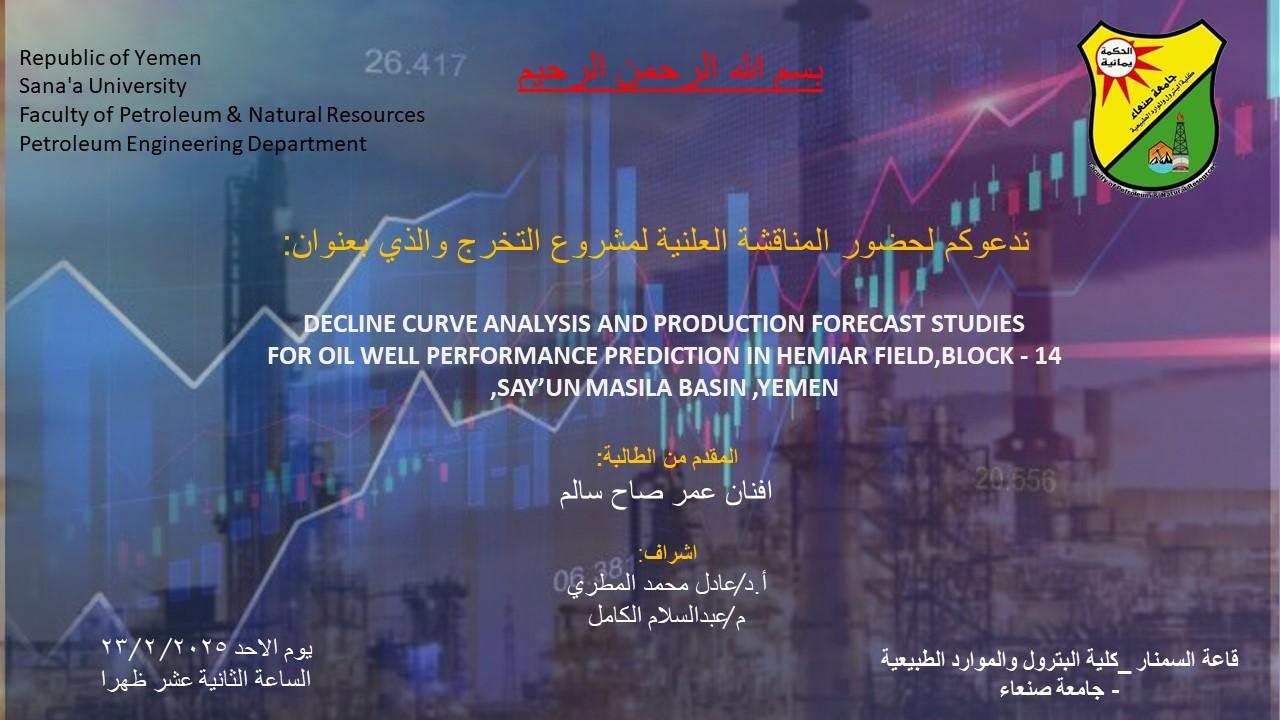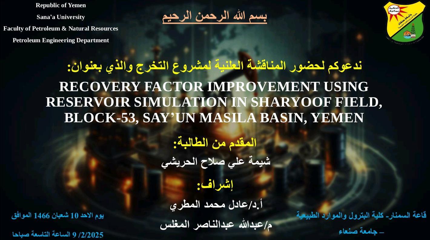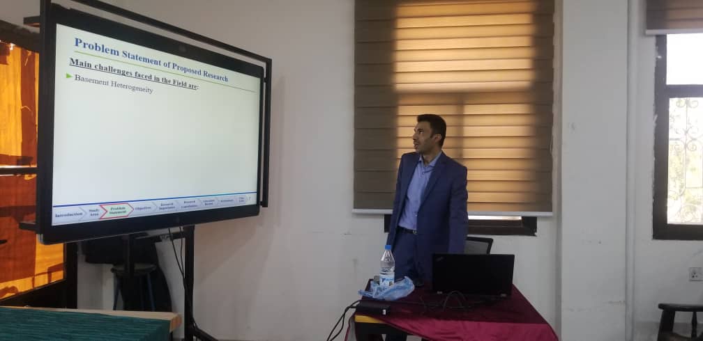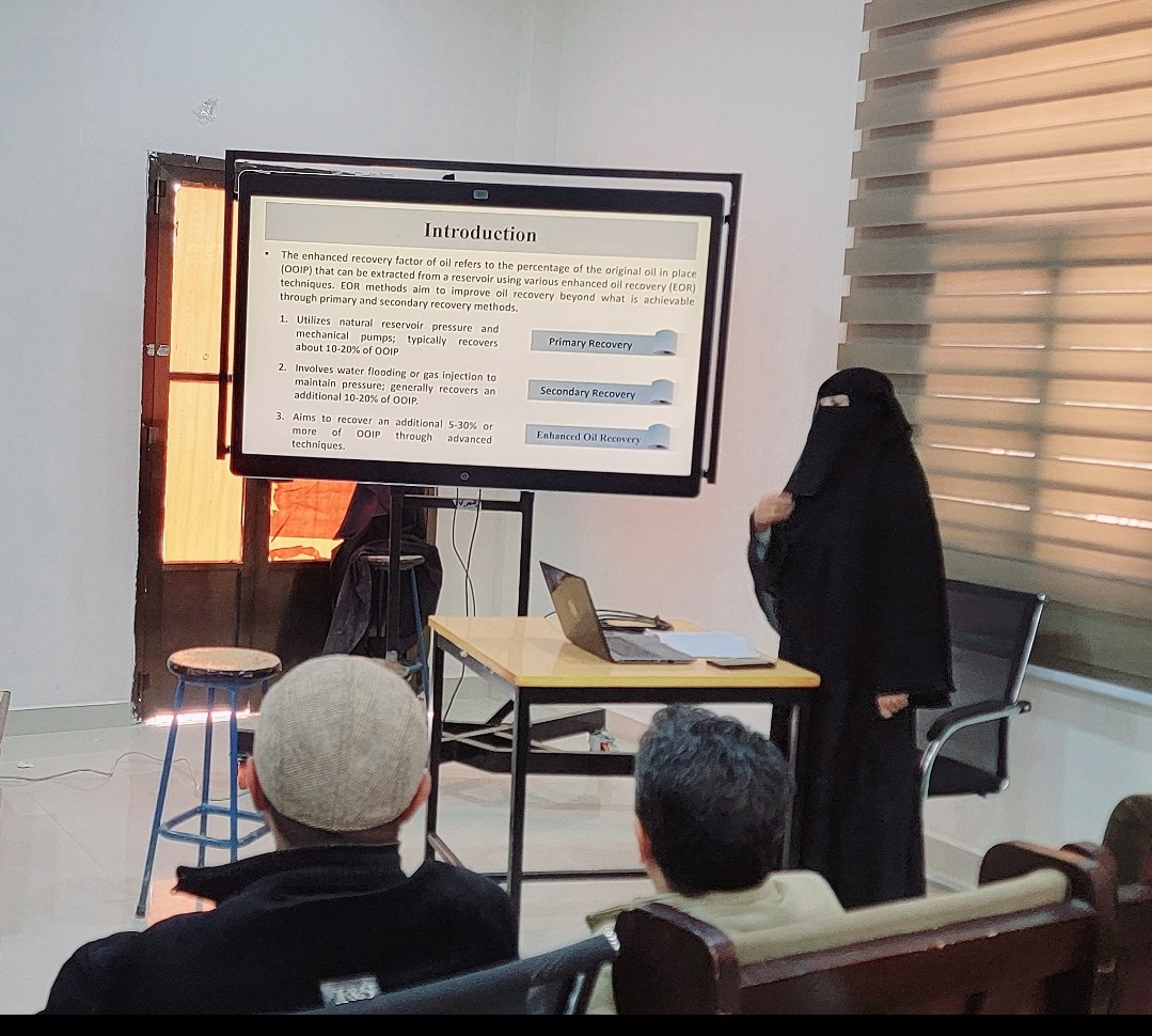 اقيم اليوم في قاعة السيمنار بكلية البترول سيمنار تحت عنوان الرساله Enhanced Oil Recovery by polymer flooding Technology in Heijh Field ,(block 14 ) , Sayun-Masila Basin, yemen . للباحث عمرو خالد عبدالوهاب محمد