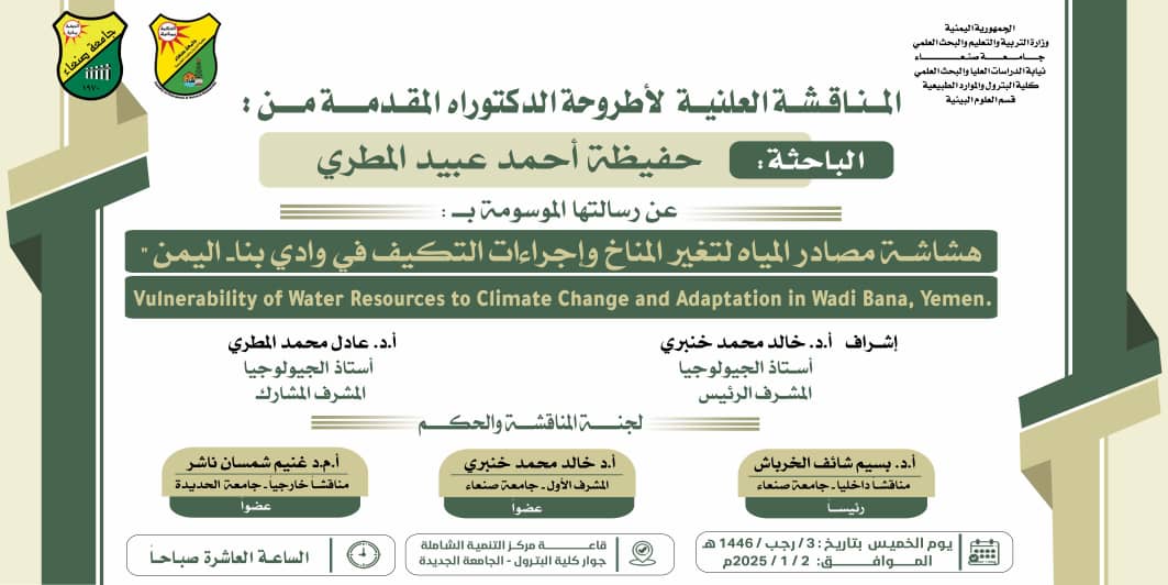 نالت الباحثة حفيظة احمد عبيد المطري دكتور في قسم (علوم الأرض) تخصص (هيدروجيولوجي) من كلية (البترول الطبيعية) في صنعاء عن اطروحتها الموسومة بـ(هشاشة مصادر المياه لتغير المناخات التكيف في وادي بنا- اليمن) يوم الخميس 2/ 7 /1446 موافق 2/1/2025م. ملحت …