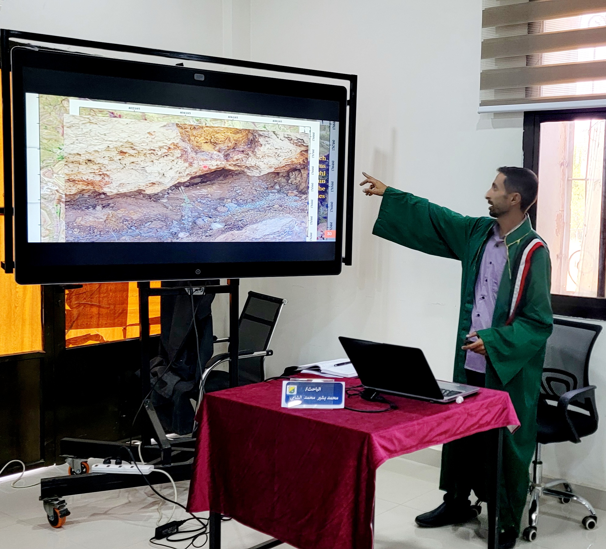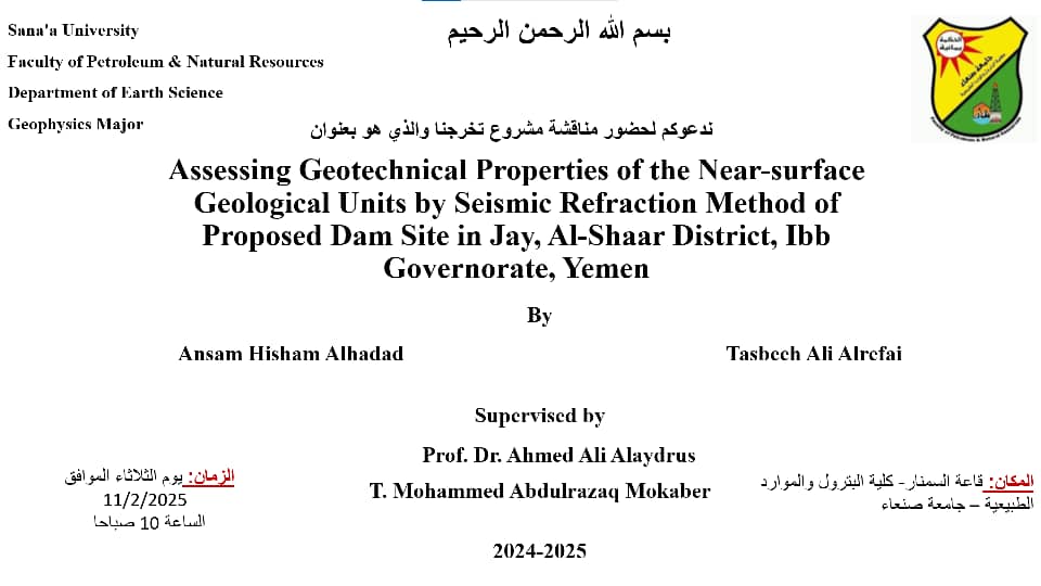 سمنار لعرض مقترح رسالة الماجستير المقدمة من الطالب / ابراهيم عبدالله الزبيري بعنوان Slope Stability Assessment of sedimentary rocks in Amran & Hajjah governates, Yeme. تقييم استقراريه المنحدرات للصخور الرسوبية في محافظتي عمران وحجة، اليمن