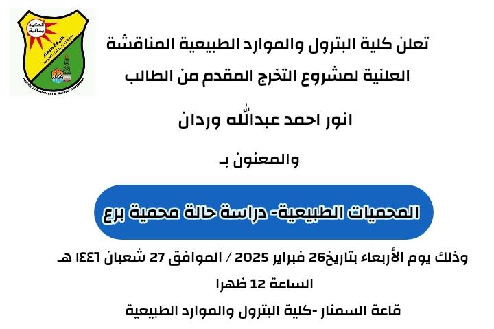 تابع مناقشات مقررات البكلريوس علوم الارض في كلية البترول والموارد الطبيعية يومنا هذا الأربعاء الموافق 2024/5/8م في قاعة سمنارات ومناقشات الكلية المشروع الرئيسي في تخصص الجيوفيزياء قسم علوم الارض .