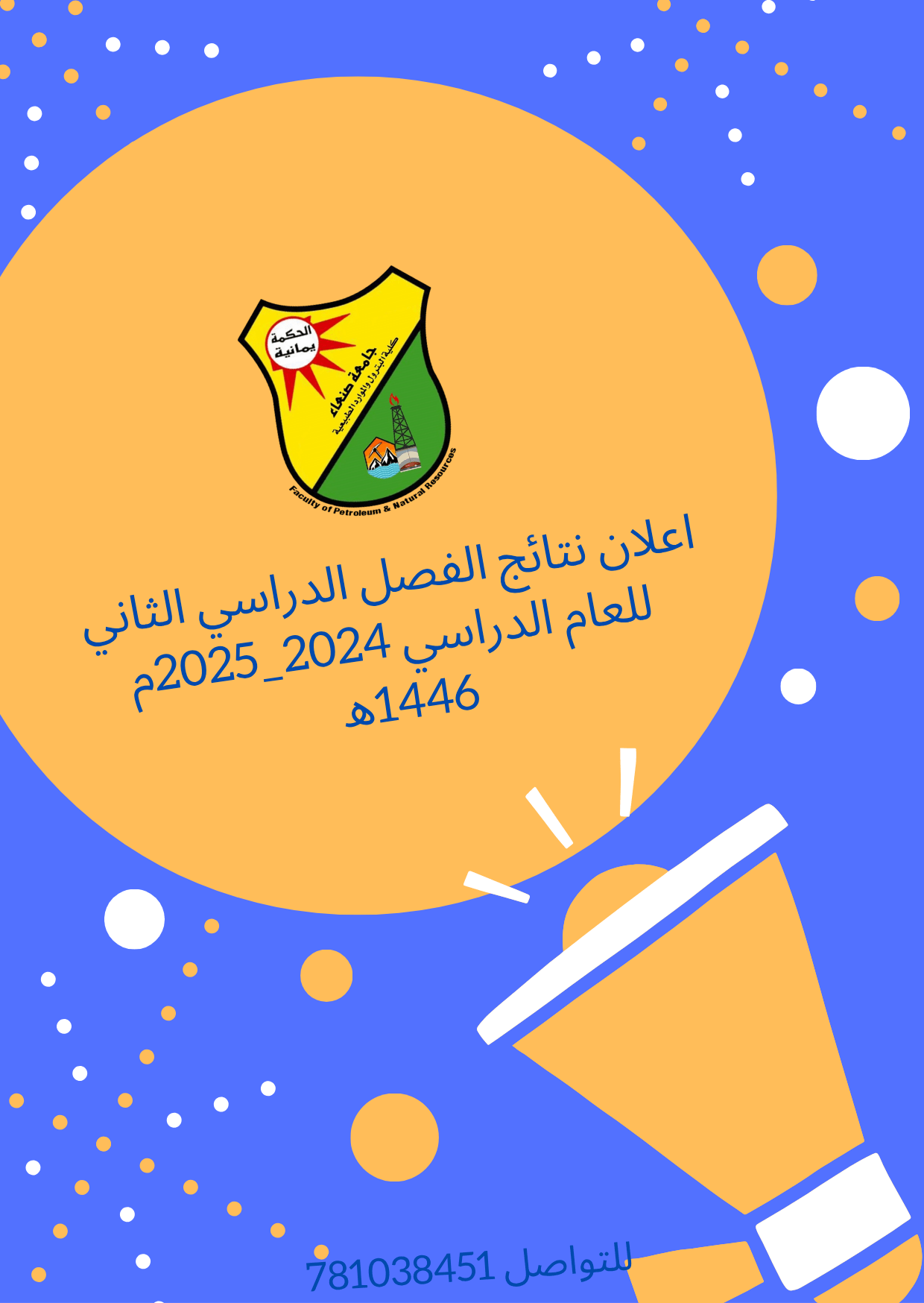 تعلن كلية البترول والموارد الطبيعية بجامعة صنعاء عن صدور نتائج الفصل الدراسي الثاني للعام الجامعي 1446هـ، الموافق 2024/2025م. وبهذه المناسبة، تدعو الكلية جميع الطلاب إلى الاطلاع على نتائجهم عبر الموقع الإلكتروني (بوابة الطالب الجامعية) من خلال الرابط التالي: https://sar.su.edu.ye/getes/6