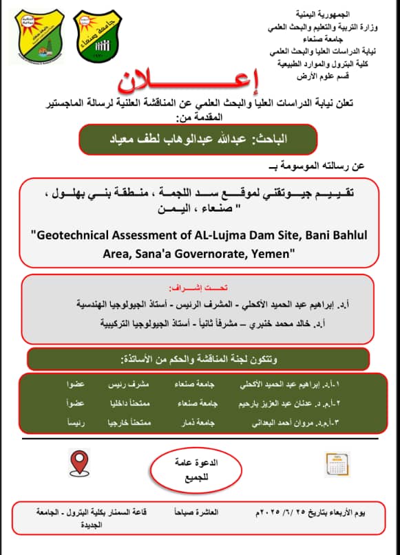 نال الباحث عبدالله عبدالوهاب لطف معياد درجة الماجستير في الجيولوجيا الهندسية، بتقدير “ممتاز”، من كلية البترول والموارد الطبيعية، جامعة صنعاء، عن رسالته الموسومة بـ “تقييم جيوتقني لموقع سد اللجمة، منطقة بني بهلول، صنعاء، اليمن” يوم الأربعاء تاريخ 25 يونيو 2025م. …