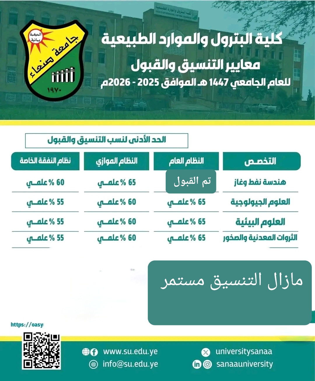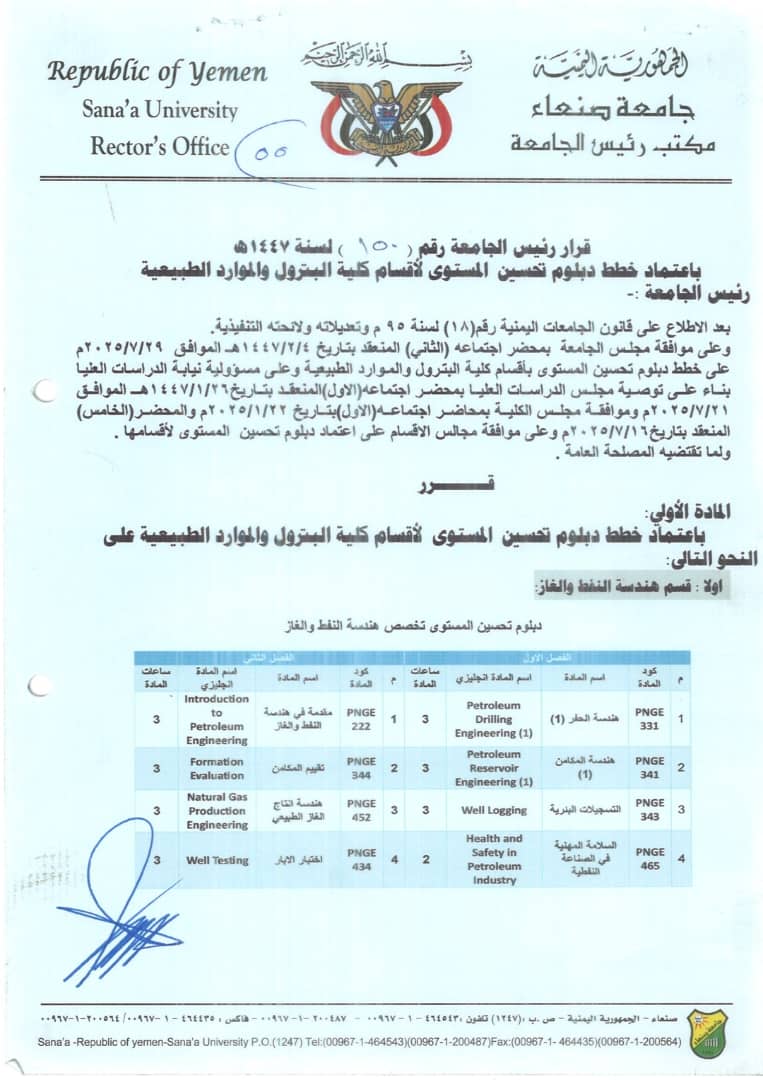 تمديد التنسيق في تخصصات كلية البترول والموارد الطبيعية تعلن نيابة رئاسة جامعة صنعاء لشؤون الطلاب عن تمديد التنسيق في كلية البترول والموارد الطبيعية لتخصص هندسة النفط والغاز (موازي ونفقة خاصة) وبقية التخصصات (عام وموازي ونفقة خاصة) للعام الجامعي 1447هـ 2025/2026م. …