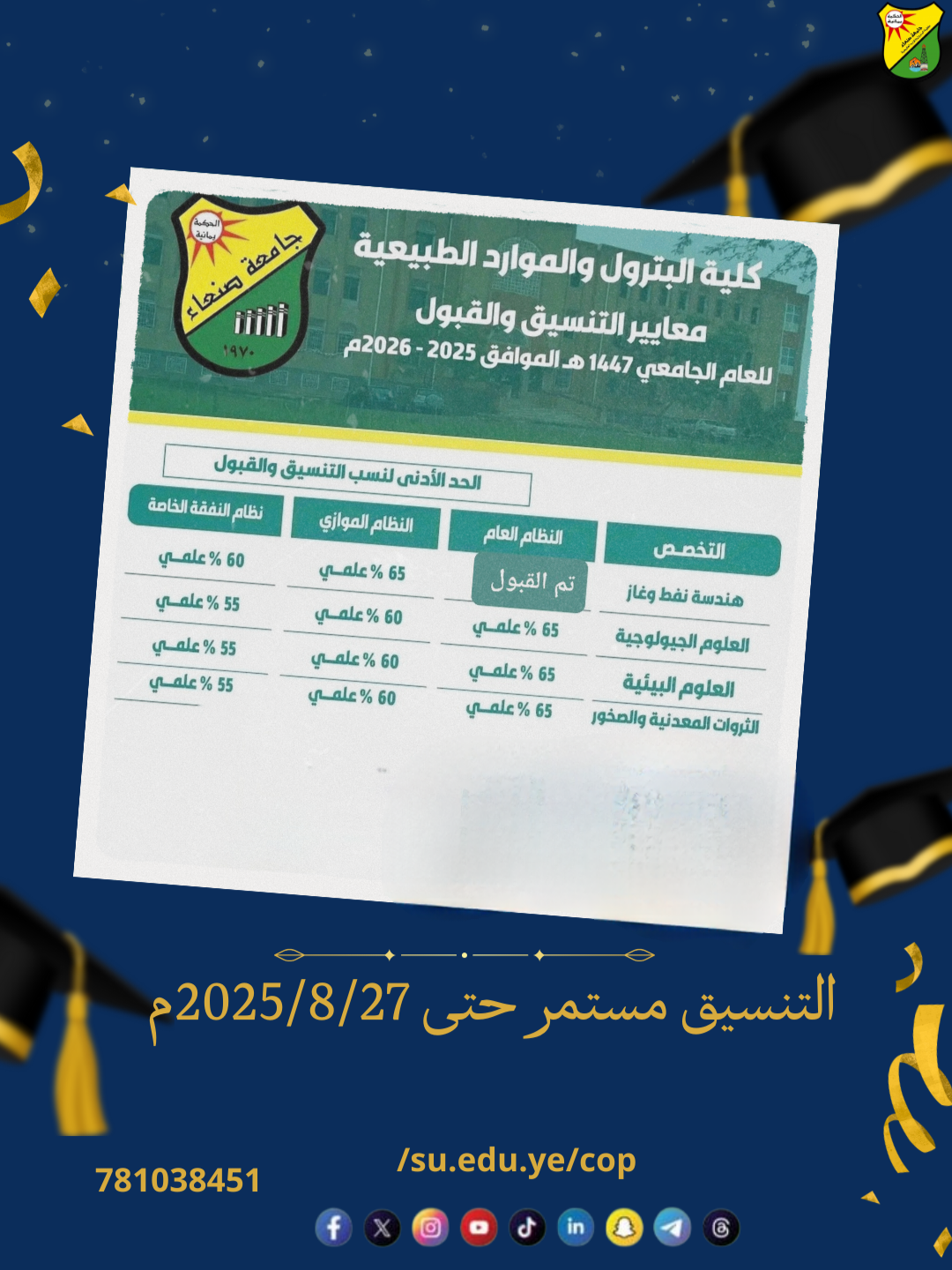تُعلن عمادة كلية البترول والموارد الطبيعية عن تمديد فترة التنسيق للقبول في الكلية حتى يوم الثلاثاء الموافق 27 أغسطس 2025، وذلك لإتاحة الفرصة لأكبر عدد من الطلبة لاستكمال إجراءات التنسيق. وعليه، ندعو جميع الطلاب الراغبين في الالتحاق بالكلية إلى الاستفادة …