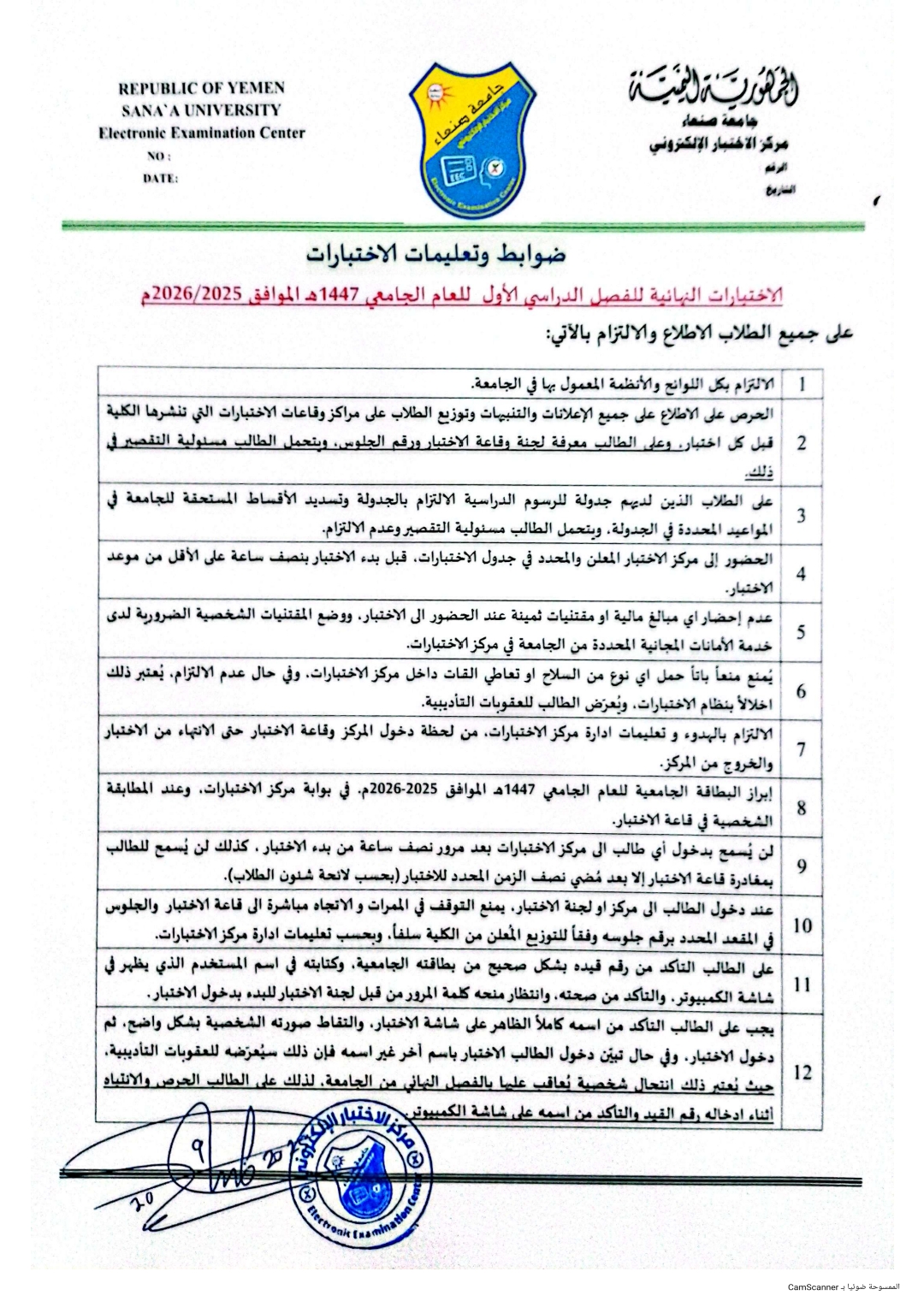 مازالت الاختبارات النهائية للترم الاول للعام الجامعي 2026/2025م قائمة على الثبات والانضباط لطلاب الكلية في المركز الاختباري الالكتروني باشراف عميد الكلية ونائب العميد لشؤون الطلاب ورئيسة الكنترول ومدير النظم في الكلية مع تمنياتنا لجميع طلابنا بالتوفيق والنجاح