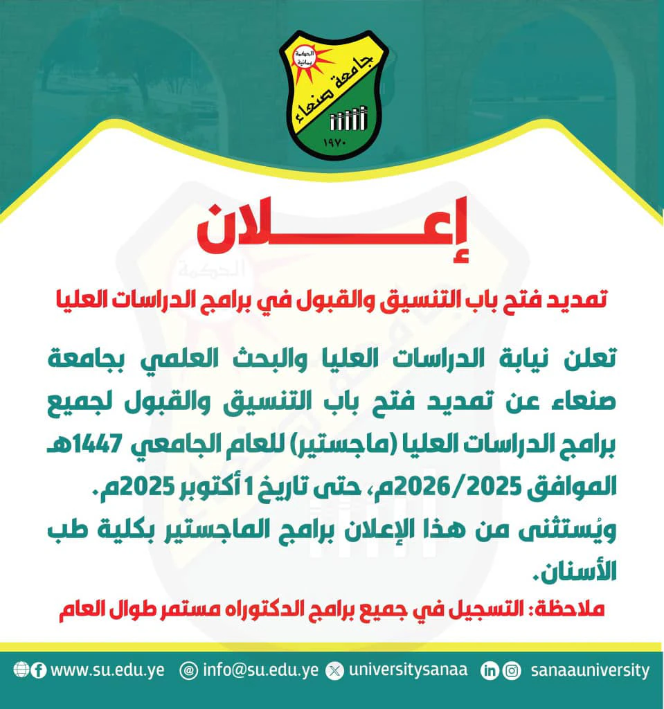 تعلن نيابة الدراسات العليا والبحث العلمي بجامعة صنعاء عن تمديد فتح باب التنسيق والقبول لجميع برامج الدراسات العليا (ماجستير) للعام الجامعي 1447هـ الموافق 2025/2026م، حتى تاريخ 1 أكتوبر 2025م. ويُستثنى من هذا الإعلان برامج الماجستير بكلية طب الأسنان. ملاحظة: التسجيل …