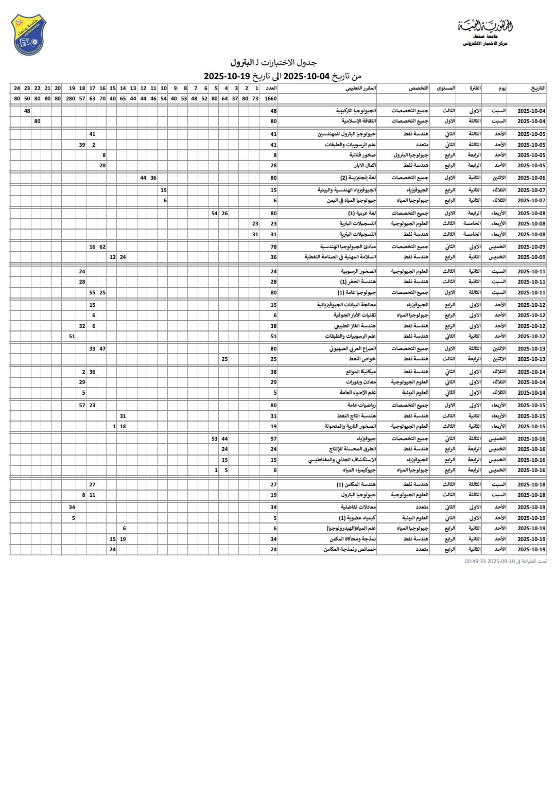 الخميس/16/أكتوبر/2025م اختتمت اليوم الخميس امتحانات الفصل الأول من التخصص الأول الجامعي 1447هـ موافق 2025–2026م، لكل من المستوى الأول جميع التخصصات ومستوى ثاني هندسة نفط وغاز في كلية البترول الأساسية في صنعاء والتي أُجريت بشكل كامل المطبوعات لجميع الطلاب. وجرت الامتحانات …