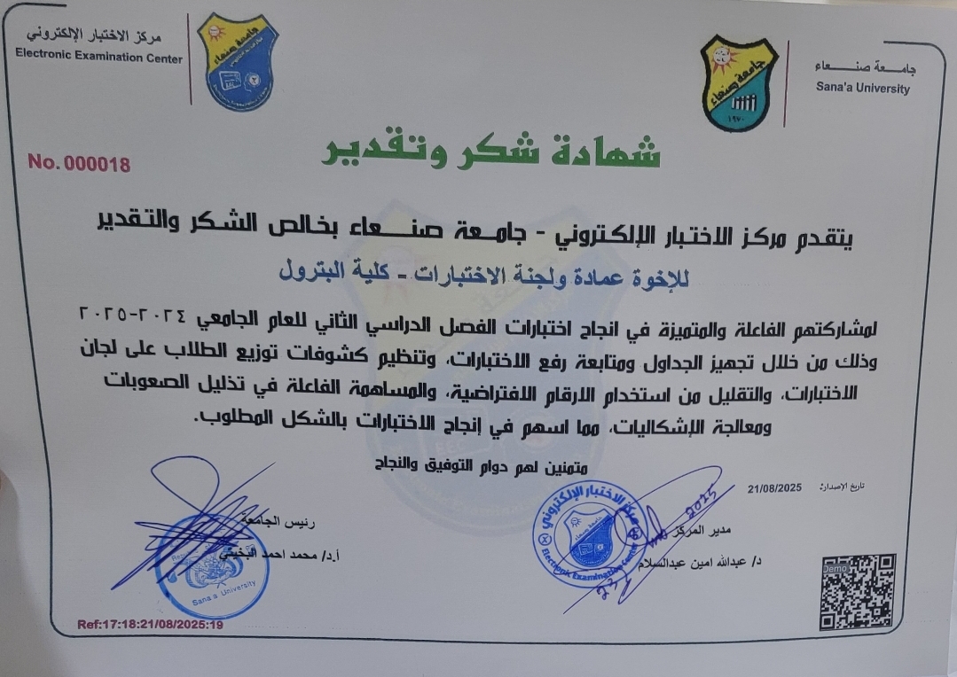 حصلت لجنة الاختبارات في كلية البترول والموارد الطبيعية – جامعة صنعاء على شهادة شكر وتقدير من مركز الاختبارات الإلكترونية بالجامعة ،شهادة موقعة من الأستاذ الدكتور محمد أحمد البخيتي – رئيس الجامعة، تقديراً لجهودها المتميزة في تطوير الأداء الأكاديمي وضمان جودة …