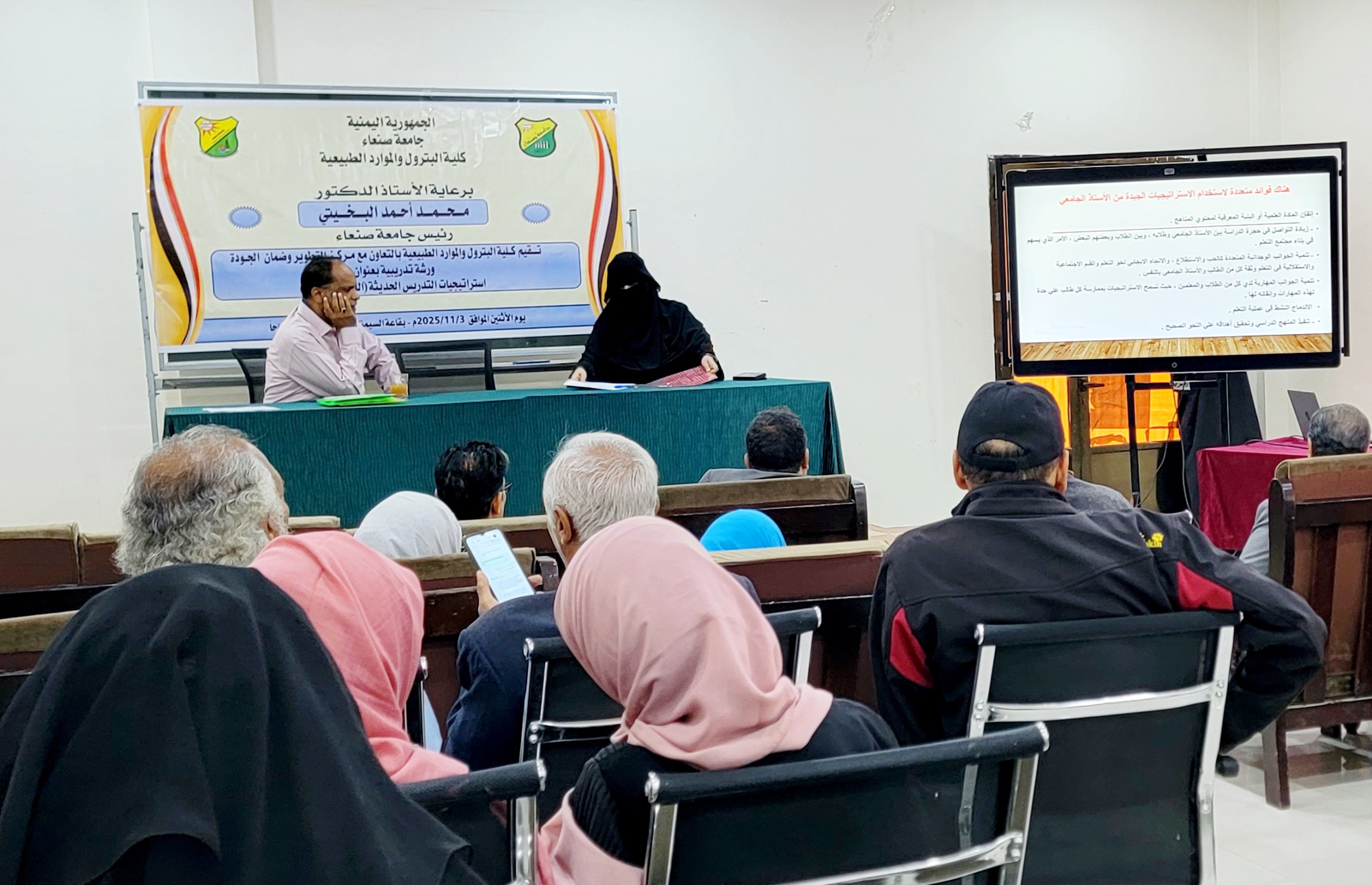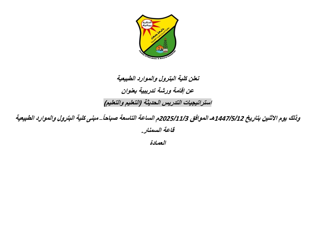 صنعاء – الاثنين 3 نوفمبر 2025م برعاية رئيس الجامعة الأستاذ الدكتور محمد البخيتي أقامت كلية البترول والموارد الطبيعية بجامعة صنعاء اليوم ورشة عمل تدريبية حول استراتيجيات التدريس الحديثة (التعليم والتعلم) بالتعاون مع مركز التطوير وضمان الجودة، وذلك في إطار خططها …