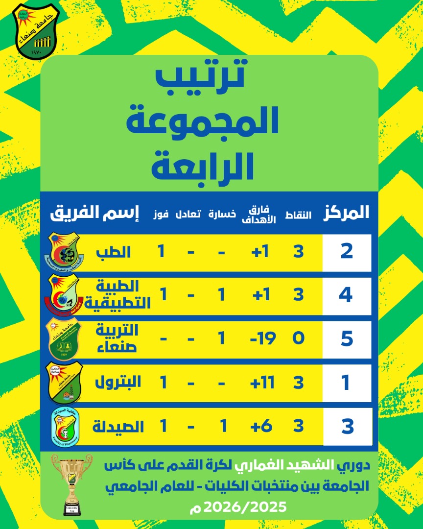 صنعاء –12-12-2025م بفخر واعتزاز، تُعلن كلية البترول والموارد الطبيعية بجامعة صنعاء عن تحقيقها المركز الأول في المجموعة الرابعة ضمن فعاليات دوري الشهيد الغماري الرياضي. ويأتي هذا الإنجاز تتويجاً للجهود الكبيرة والتدريب المكثف الذي بذله أعضاء فريق الكلية، ويعكس الروح الرياضية …