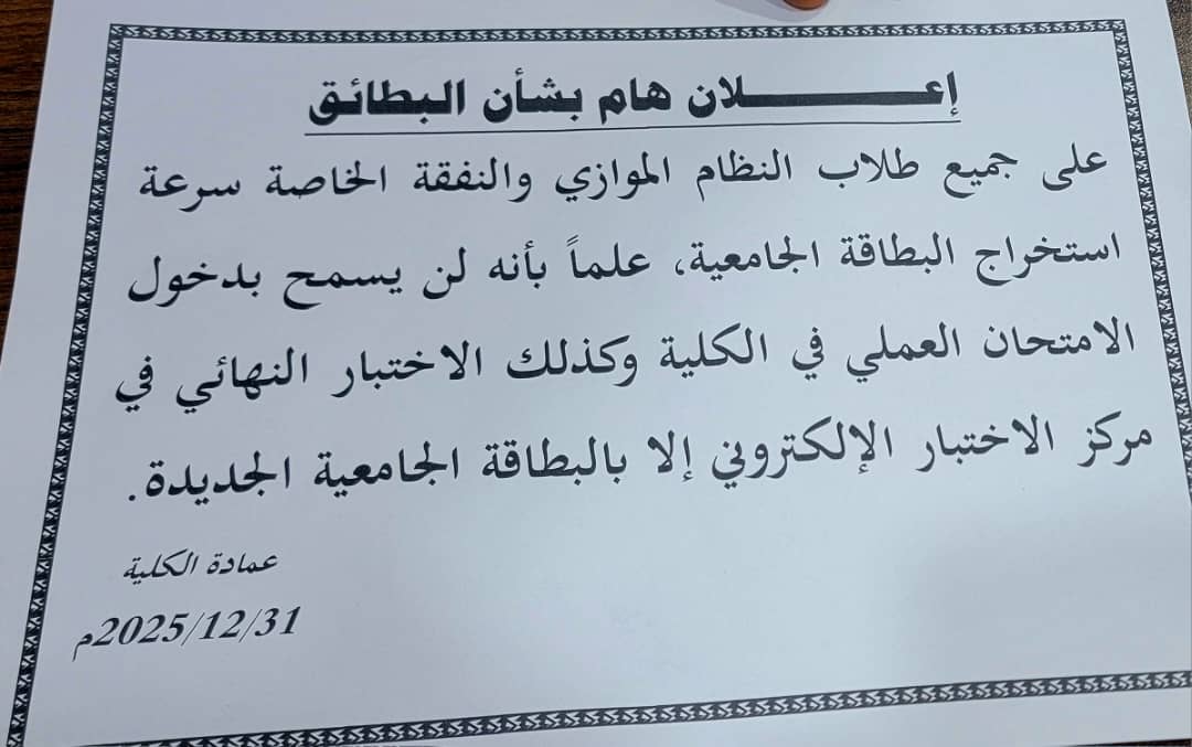 تعلن عمادة كلية البترول والموارد الطبيعية بجامعة صنعاء لكافة أبنائها الطلاب في “النظام الموازي” و “النفقة الخاصة”، بضرورة سرعة استخراج البطاقة الجامعية الجديدة. نود التنبيه انه لن يُسمح لأي طالب بدخول الامتحانات العملية داخل الكلية بدون البطاقة. ويُشترط إبراز البطاقة …