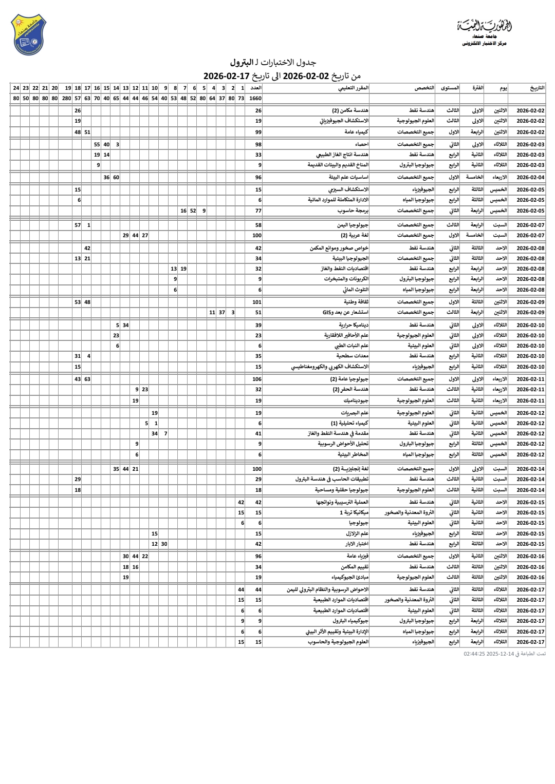 تعلن كلية البترول والموارد الطبيعية بجامعة صنعاء عن جدول امتحانات الفصل الدراسي الأول لبرنامج علوم الأرض، مع التأكيد على الالتزام بالضوابط والمواعيد والتعليمات وستبدأ من يوم السبت 17 يناير 2026م وحتى الاثنين 2 فبراير 2026م. من الساعة 10:00 صباحاً …