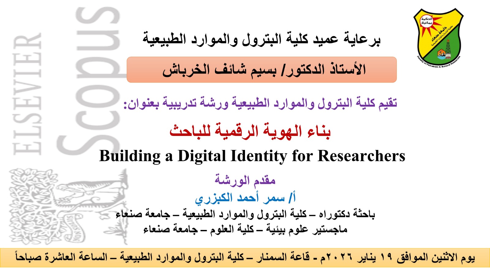[صنعاء – 2026/1/21م] تحت رعاية عميد كلية البترول والموارد الطبيعية، الأستاذ الدكتور بسيم شائف الخرباش، نظمت الكلية اليوم الأربعاء، الموافق 21 يناير 2026م، ورشة تدريبية نوعية بعنوان: “بناء الهوية الرقمية للباحث” (Building a Digital Identity for Researchers)، والتي قدمتها الباحثة …