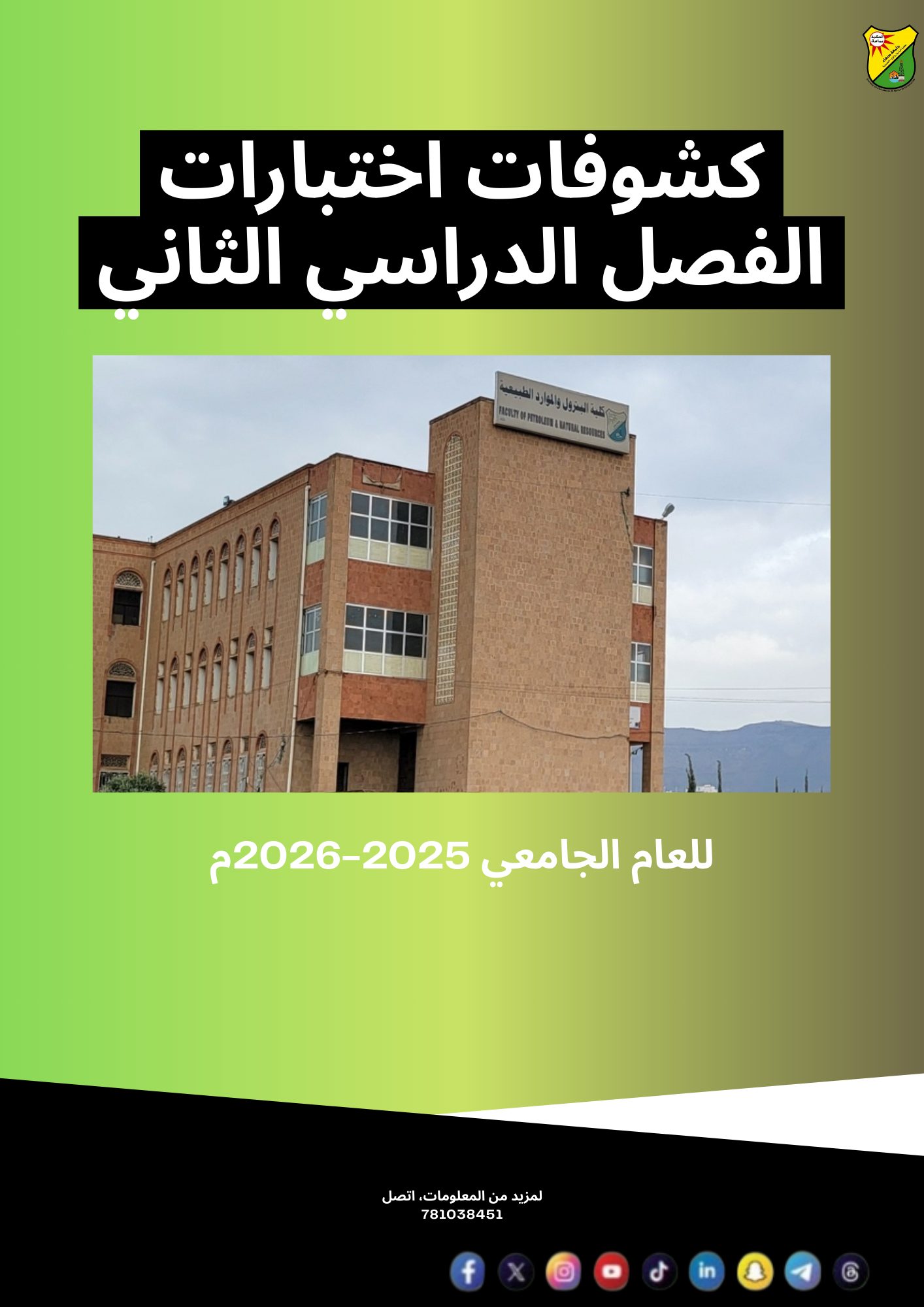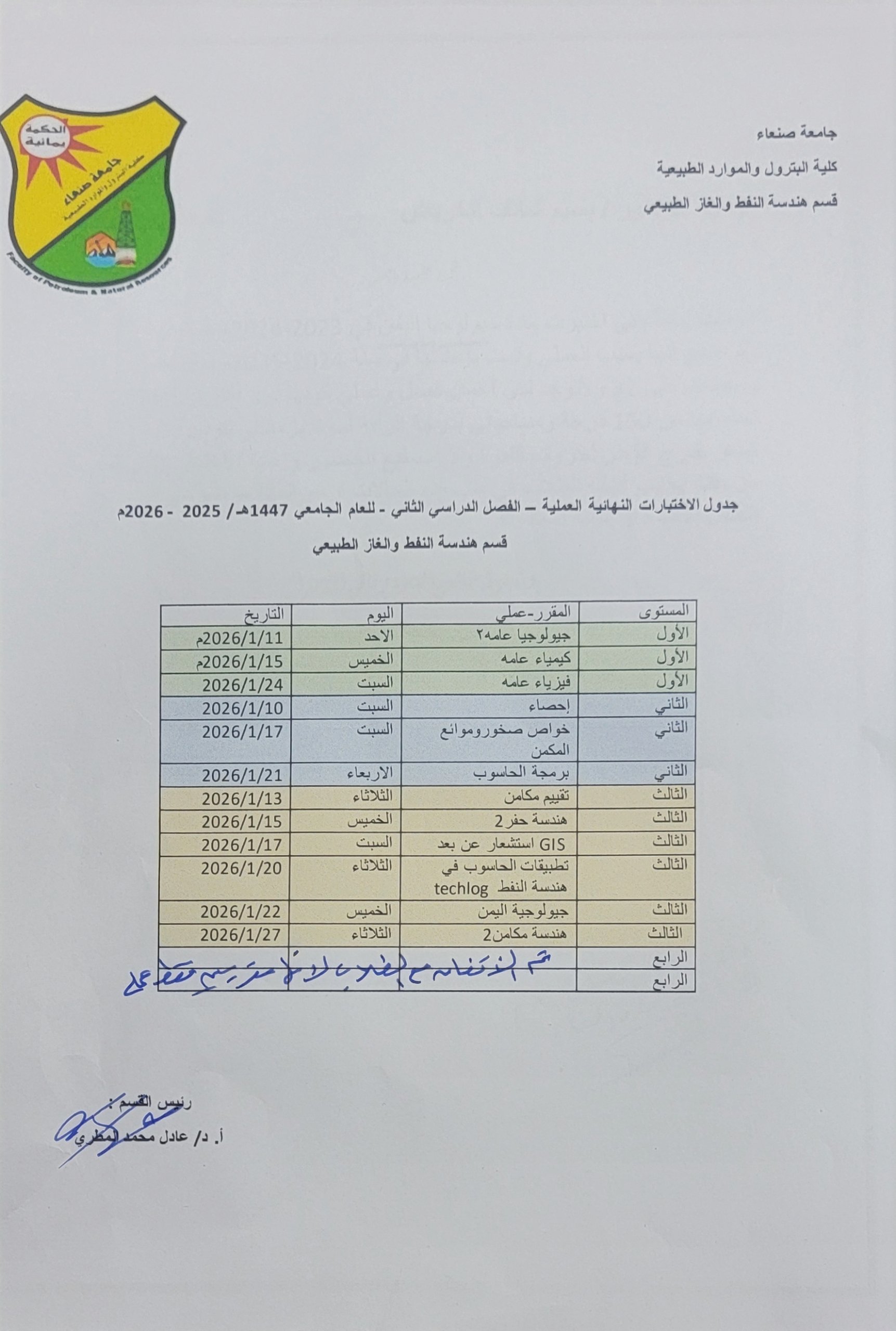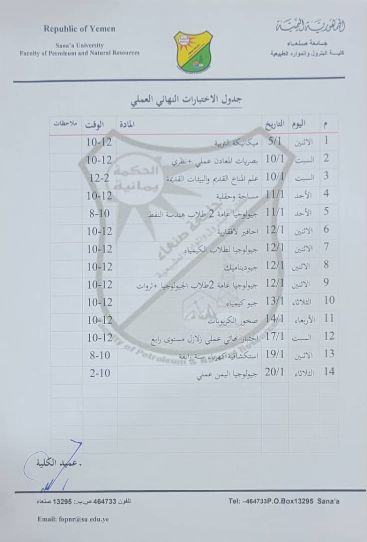 يعلن قسم هندسة النفط والغاز الطبيعي بكلية البترول والموارد الطبيعية – جامعة صنعاء، عن جدول الاختبارات النهائية العملية للفصل الدراسي الثاني للعام الجامعي 1447هـ / 2025 – 2026م. حيث ستبدأ الاختبارات يوم الأحد (11 يناير) بمادة جيولوجيا عامة 2. و …