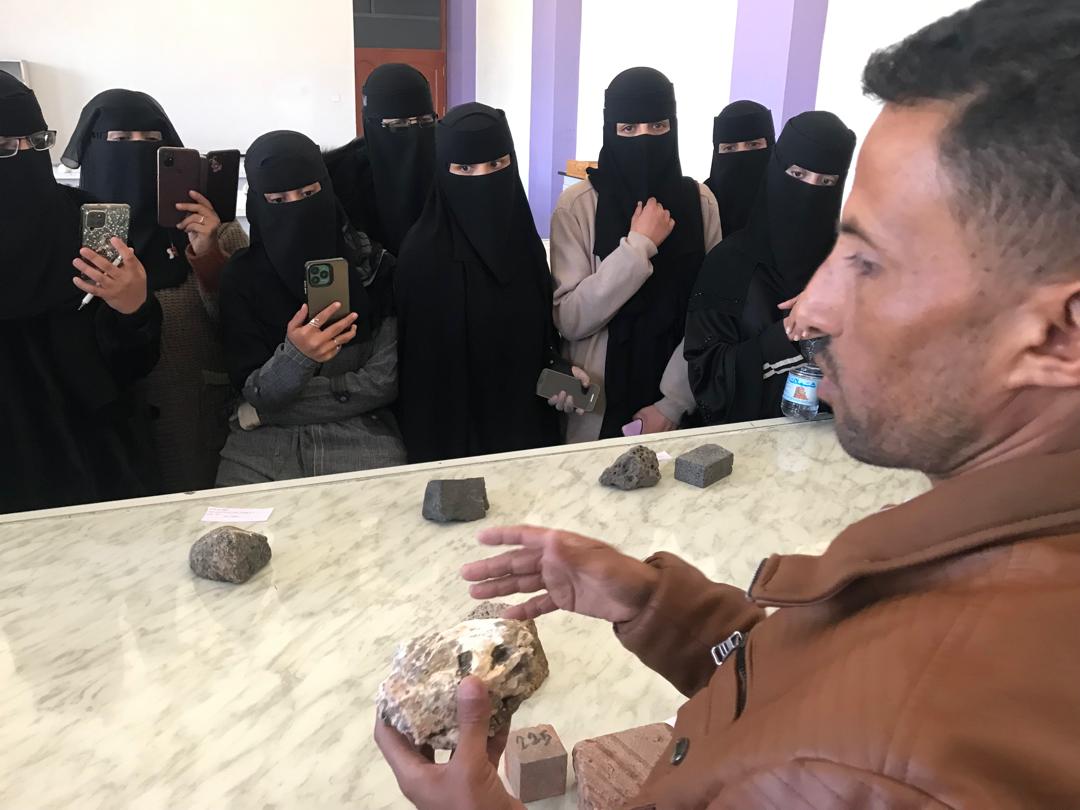 On Thursday, the Faculty of Petroleum and Natural Resources at Sana’a University received a delegation of students from the Social Studies Department of the Higher Institute for Teacher Training and Qualification in the Capital Municipality. The scientific visit aimed to enhance field knowledge regarding natural and geological resources.