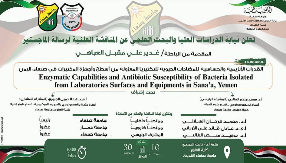 إعلان المناقشة العلنية للباحثة: غدير العباهي Posted by كلية العلوم جامعة صنعاء التصنيفات الأخبار Date ديسمبر 29, 2025 Share: كلية العلوم جامعة صنعاء المقال السابق الماجستير للباحثة هديل خالد محمد من قسم العلوم الحياتية بكلية العلوم ديسمبر 29, 2025 المقال التالي ختام الدورة التدريبية في الكفاءة الحيوية لحماية المحاصيل الزراعية ديسمبر 30, 2025 You may also like إعلان: جداول الاختبارات العملية النهائية للفصل الدراسي الثاني 1447هـ – كلية العلوم 7 يناير, 2026 ختام الدورة التدريبية في الكفاءة الحيوية لحماية المحاصيل الزراعية 30 ديسمبر, 2025 الماجستير للباحثة هديل خالد محمد من قسم العلوم الحياتية بكلية العلوم 28 ديسمبر, 2025
