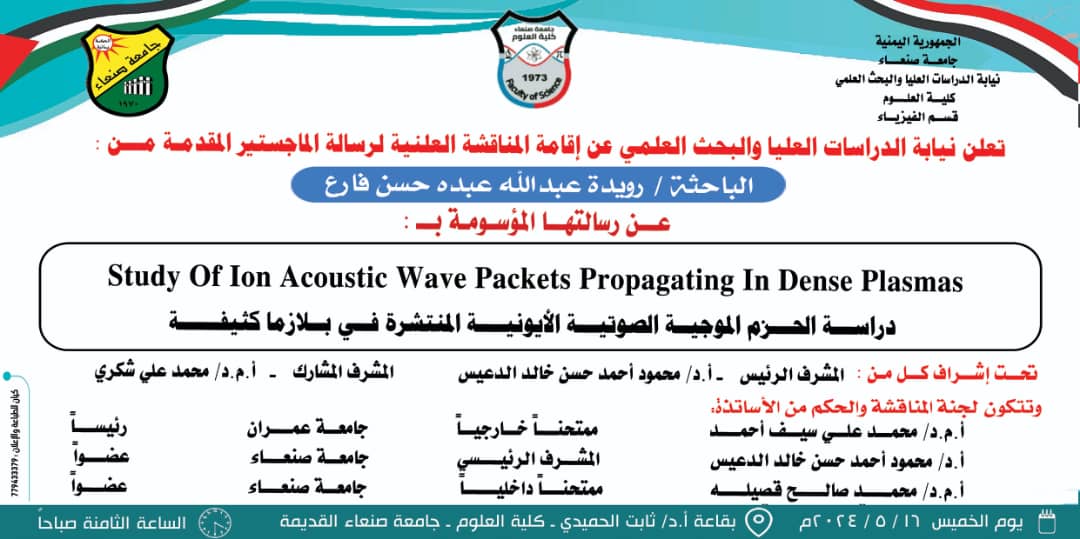 إعلان سمنار مناقشة رسالة الماجستير للباحث: باسم الاكحلي