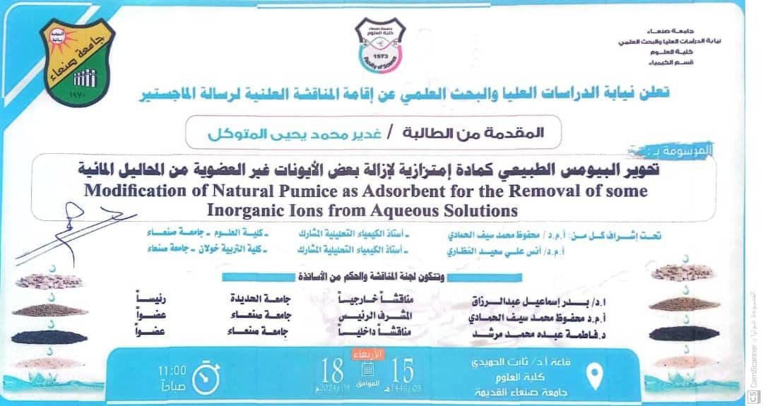 إعلان سمنار مناقشة رسالة الماجستير للباحث: باسم الاكحلي