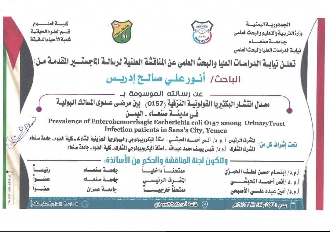 إعلان المناقشة العلنية لرسالة الماجستير للطالب انور علي إدريس Posted by كلية العلوم جامعة صنعاء التصنيفات الأخبار Date ديسمبر 30, 2024 Share: كلية العلوم جامعة صنعاء المقال السابق فريق المراجعين الخارجيين للاعتماد المؤسسي يختتم زيارته الميدانية لكلية العلوم بجامعة صنعاء ديسمبر 30, 2024 المقال التالي 📢تعميمات هامة لطلاب الدراسات العليا 📢 ديسمبر 30, 2024 You may also like إعلان سمنار مناقشة رسالة الماجستير للباحث: باسم الاكحلي 30 مارس, 2026 إعلان عن دورة تدريبية لمدة اسبوع في مختبرات الميدلاب 28 مارس, 2026 إعلان هام للطلاب الباقون للإعادة 25 مارس, 2026