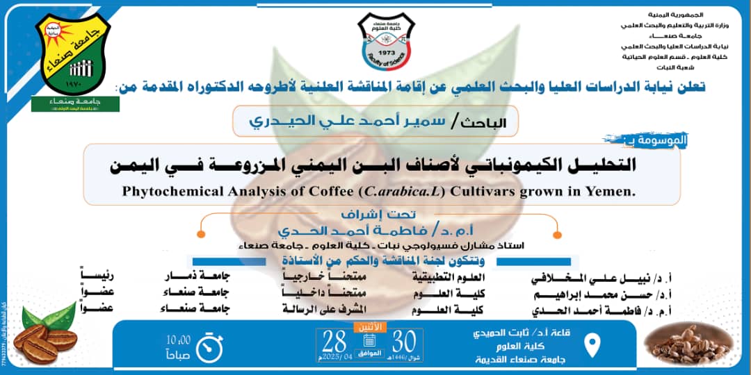 إعلان المناقشة العلنية لأطروحة الدكتوراه للباحث: سمير الحيدري Posted by كلية العلوم جامعة صنعاء التصنيفات الأخبار Date أبريل 27, 2025 Share: كلية العلوم جامعة صنعاء المقال السابق إعلان تسجيل أطروحة الدكتوراه للباحث: جلال الأكحلي أبريل 27, 2025 المقال التالي إنطلاق المؤتمر الثاني لابحاث التخرج 2025 مايو 3, 2025 You may also like إعلان سمنار مناقشة رسالة الماجستير للباحث: باسم الاكحلي 30 مارس, 2026 إعلان عن دورة تدريبية لمدة اسبوع في مختبرات الميدلاب 28 مارس, 2026 إعلان هام للطلاب الباقون للإعادة 25 مارس, 2026