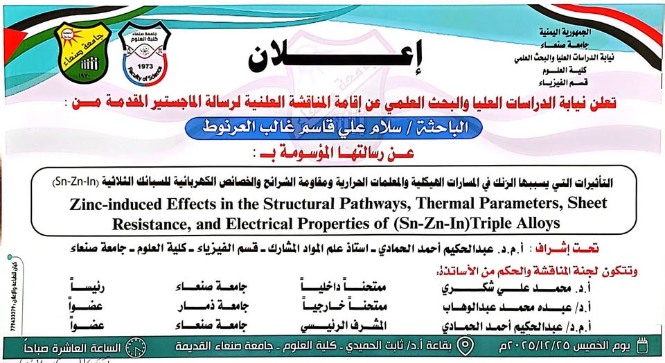 إعلان المناقشة العلنية لرسالة الماجستير للباحة: سلاك العرنوط